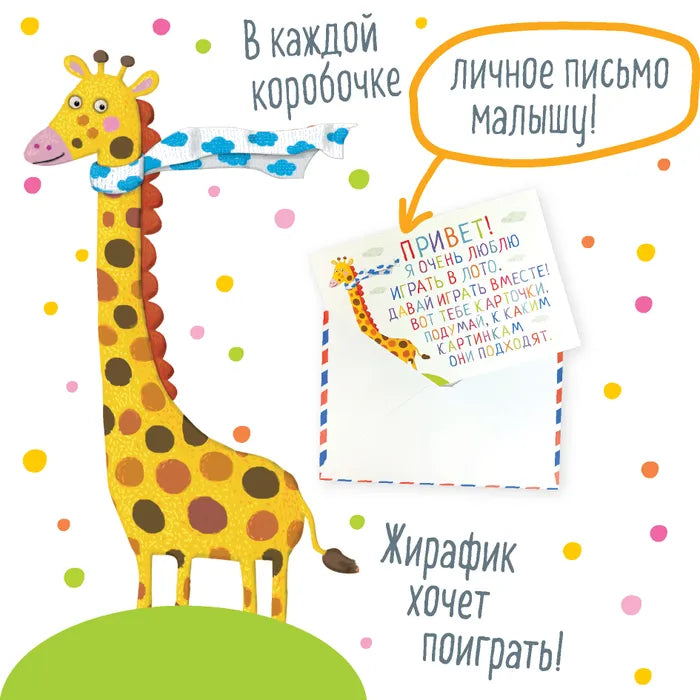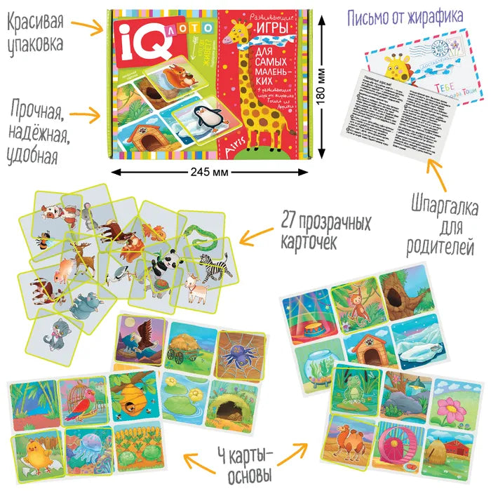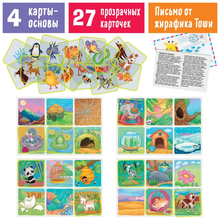 В наборе 4 картонные карты, 27 прозрачных карточек и конверт, в котором ребёнок найдёт письмо от жирафа Тоши, а взрослые - инструкцию.