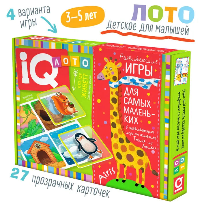 Игровой набор «Кто где живёт?» — лото, но не обычное, а обучающее, с прозрачными карточками. На картах-основах представлены места обитания и предметы, так или иначе связанные с различными животными. Ребёнку предстоит внимательно рассмотреть иллюстрацию и подобрать пластиковую карточку с подходящим животным. Прозрачные карточки позволяют малышу экспериментировать и самостоятельно искать решение.