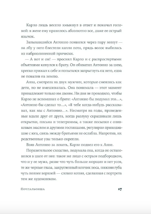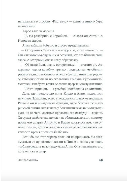 Дебютный роман молодой итальянской писательницы Франчески Джанноне, ставший литературной сенсацией в Италии. Роман основан на истории прабабушки автора, в нем рассказывается о жизни Анны — молодой женщины с севера Италии, в 1934 году переехавшей вместе с семьей на юг страны, на родину мужа. Став первой женщиной-почтальоном в Лиццанелло, Анна бросает вызов патриархальным устоям общества. Более 20 лет, сначала пешком, а затем на велосипеде, она доставляет жителям важную корреспонденцию — это и письма солдат с фронта, и открытки от тех, кто навсегда покинул Италию, и послания тайных любовников. Анна читает письма неграмотным и даже учит их читать и писать. Сама того не замечая, смелая «чужачка» с севера многое изменит в южном городке и серьезно повлияет на положение женщин в нем.
