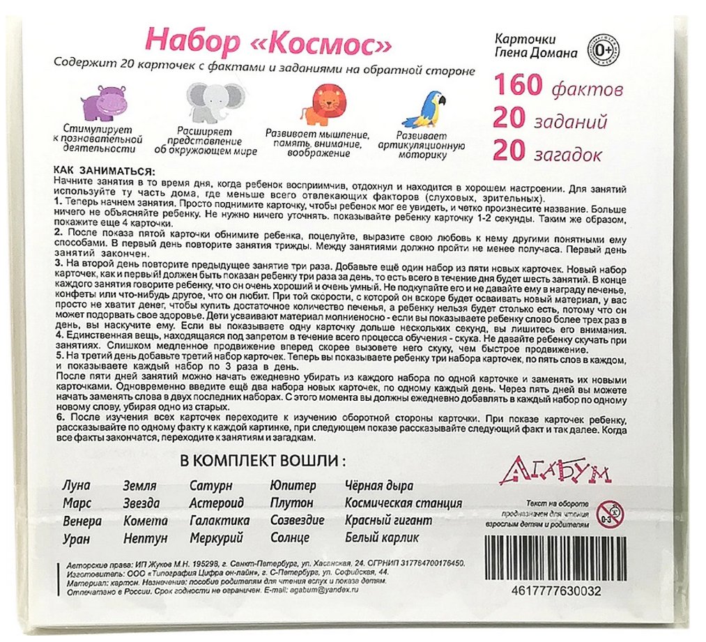 A set of 20 large cards by Glen Doman with photographs of space objects for children from 0 to 8 years old on high-quality cardboard.