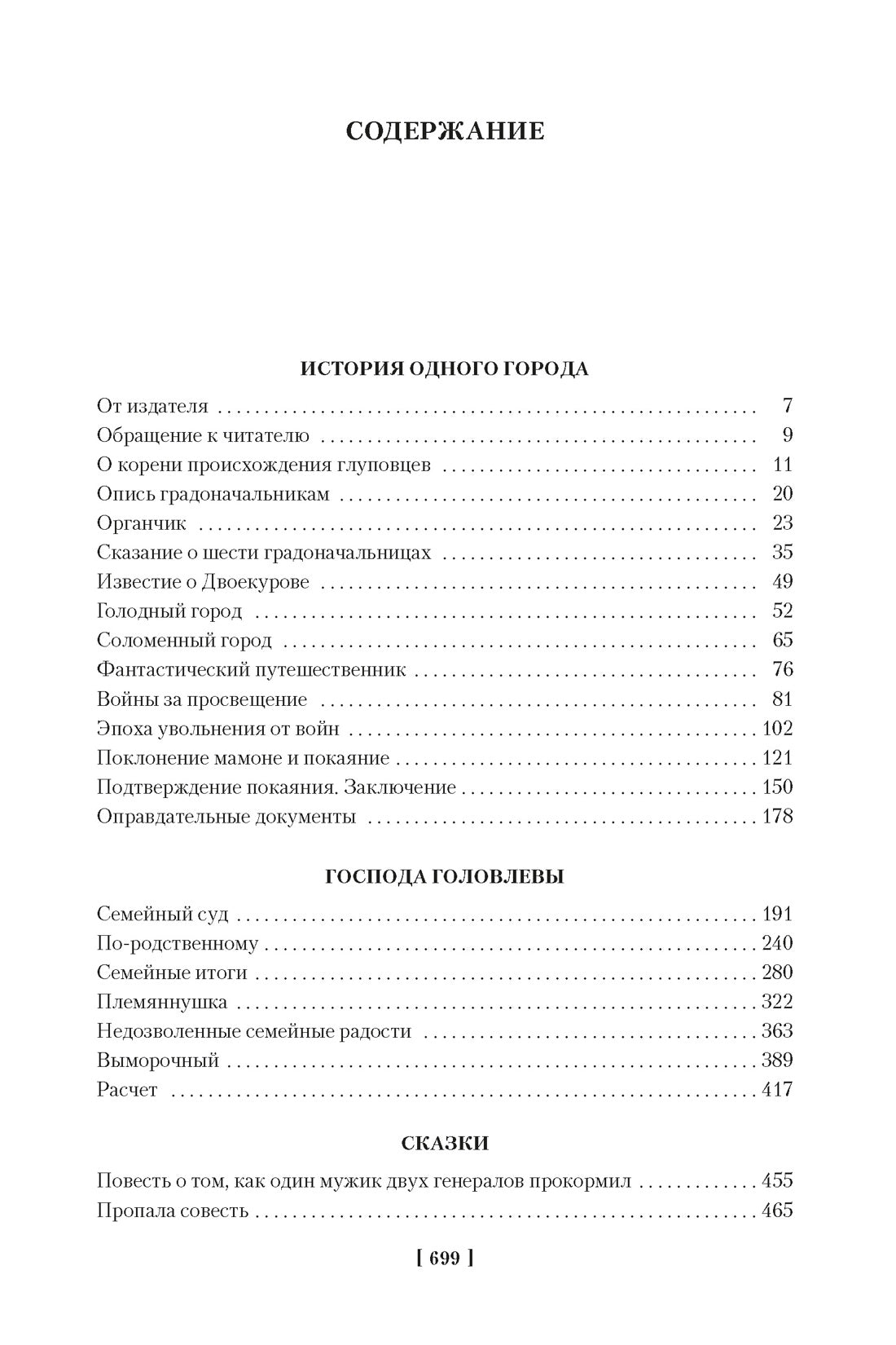 В настоящее издание вошли романы "История одного города" и "Господа Головлевы", а также сказки. Тексты печатаются с иллюстрациями Михаила Куприянова, Порфирия Крылова и Николая Соколова - выдающихся русских художников, совместно работавших под творческим псевдонимом Кукрыниксы, а также Николая Кузьмина.