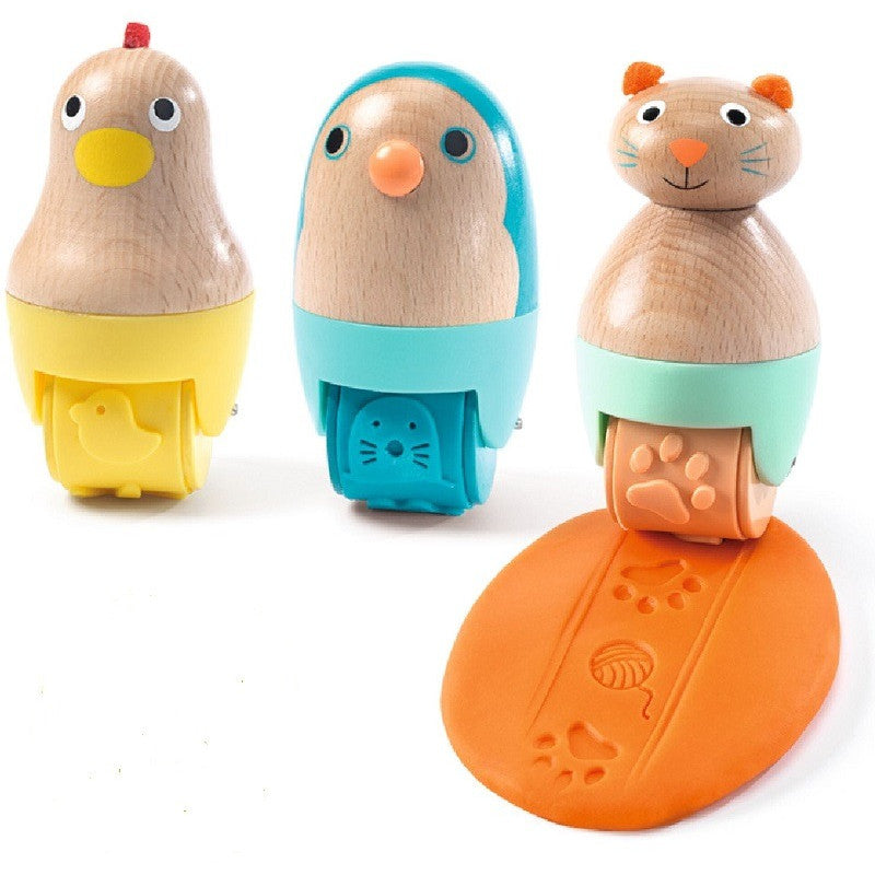 3 штампика в виде забавных зверюшек сделаны специально для маленьких ручек. Чтобы создать узор, просто проведите роликом по пластилину.