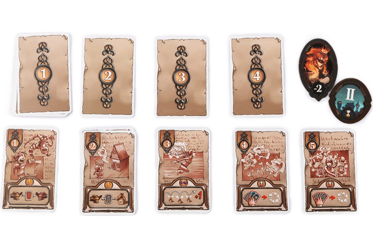 - If the player decides to cast a spell, he chooses a spell book from his hand and places the ingredients of the same color in front of him. It can then choose one of the available spells. The number of ingredients laid out determines the strength of the spell. The game ends when the ingredient cards in the deck run out. After that, the players play 3 more rounds and calculate victory points for cast spells and penalties for each remaining color of cards in their hand. The winner is the player who was able to successfully purchase and get the most victory points.