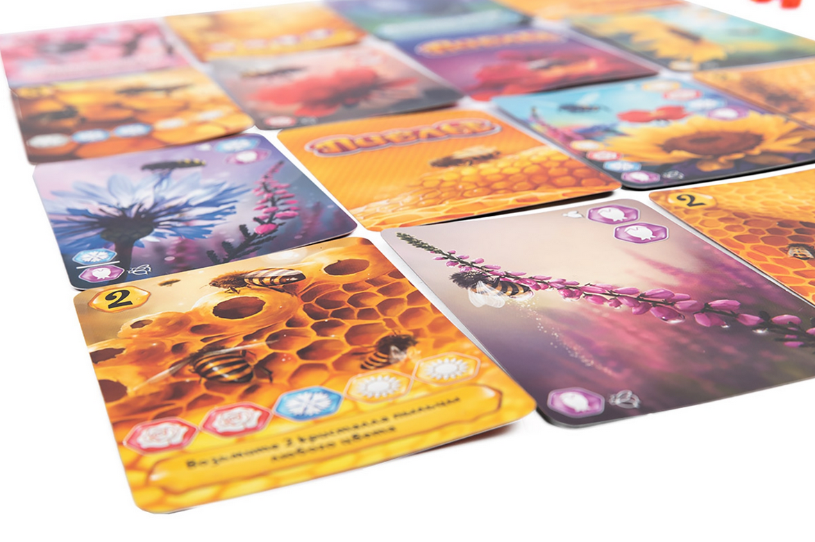 Состав игры: 22 карты пыльцы, 48 карт мёда, 5 карт ульев, 80 кристаллов пыльцы, правила.