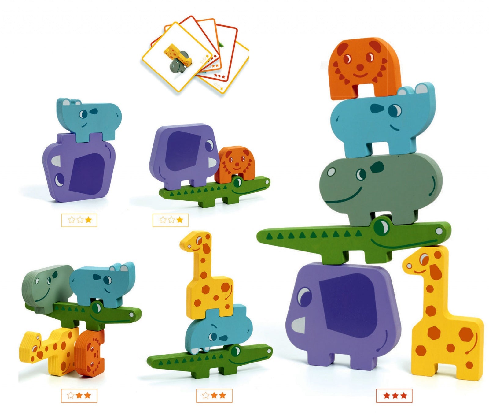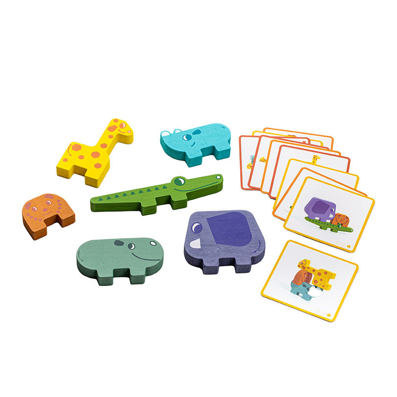 В наборе: 20 карточек с заданиями разного уровня сложности, 6 деревянных фигурок животных для строительства пирамидок.