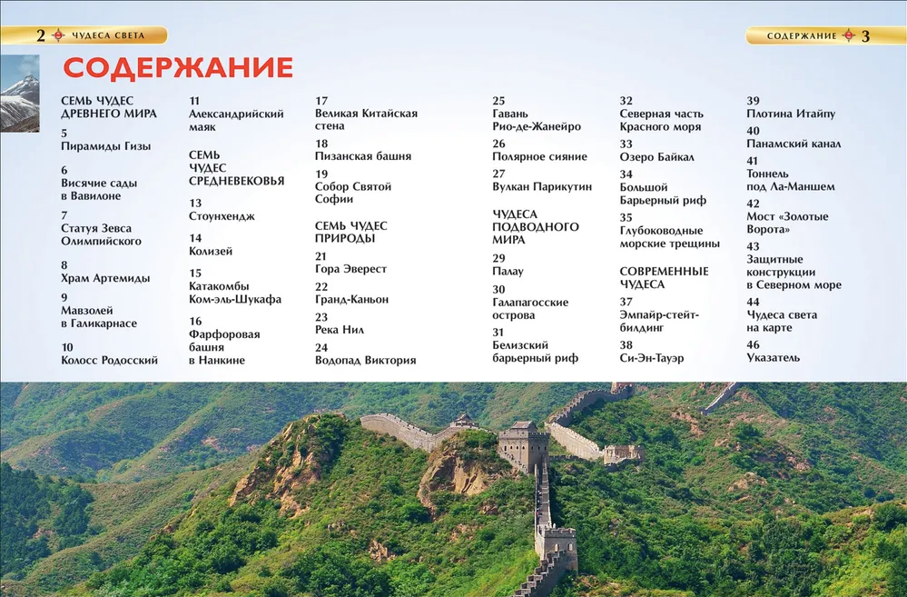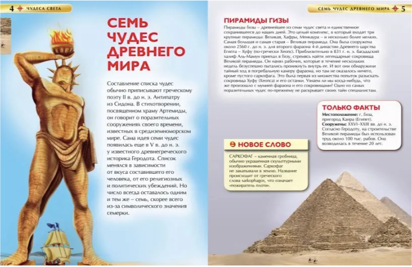 Увлекательная, красочно иллюстрированная энциклопедия об известнейших чудесах света со времен Древнего мира до наших дней. Издание станет полезным помощником в развитии интеллекта и эрудиции любознательного ребенка и наглядным пособием, дополняющим школьную программу. Энциклопедия содержит множество увлекательных фактов: чудесах света Древнего мира: Пирамиды Гизы, Висячие сады в Вавилоне, Храм Артемиды в Эфесе, Колосс Родосский и другие; Стоунхендж, Колизей, Фарфоровая башня в Нанкине, Собор Святой Софии и других памятниках Средневековья; удивительные чудеса природы: река Нил, гора Эверест, водопад Виктория, полярное сияние и другие Чудеса подводного мира, среди которых: Галапагосские острова, озеро Байкал и Большой Барьерный риф; современные впечатляющие строения и сооружения: тоннель под Ла-Маншем, плотина Итайпу в Бразилии, мост «Золотые Ворота» и других. С этой книгой читатель отправится в необычное и очень зрелищное путешествие во времени и пространстве к самым поразительным памятникам человеческой культуры. Книга расскажет, как строились и эксплуатировались строения и сооружения, какую функцию в древности выполняли природные объекты, как сохранились до наших дней. Реалистичные рисунки и иллюстрации помогут читателю наглядно представить каждый из них.