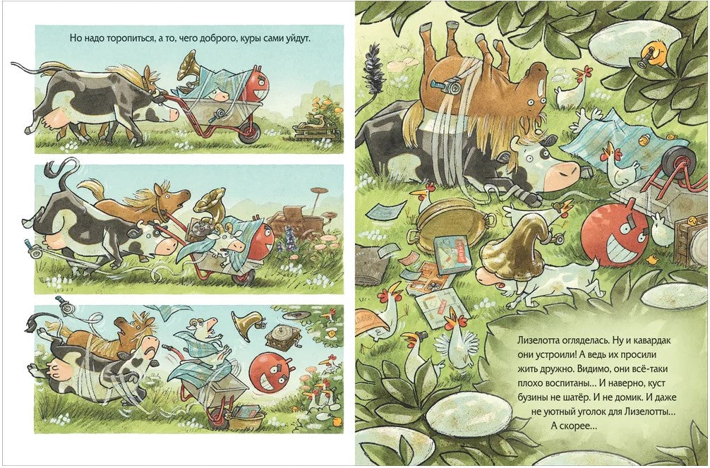 Продолжение истории о приключениях любознательной и озорной почтовой коровы Лизелотты, полюбившейся сотням тысяч детей по всему миру. Во время игры в прятки Лизелотта случайно видит развесистый куст бузины. Под ним можно устроить себе замечательный домик. Вот только коза и пони тоже давно мечтают об укромном местечке, а куры вообще собираются превратить куст в цирковой шатер. Ну ничего, неугомонная корова Лизелотта еще отвоюет свой уютный уголок. Пришло время для коварного плана!