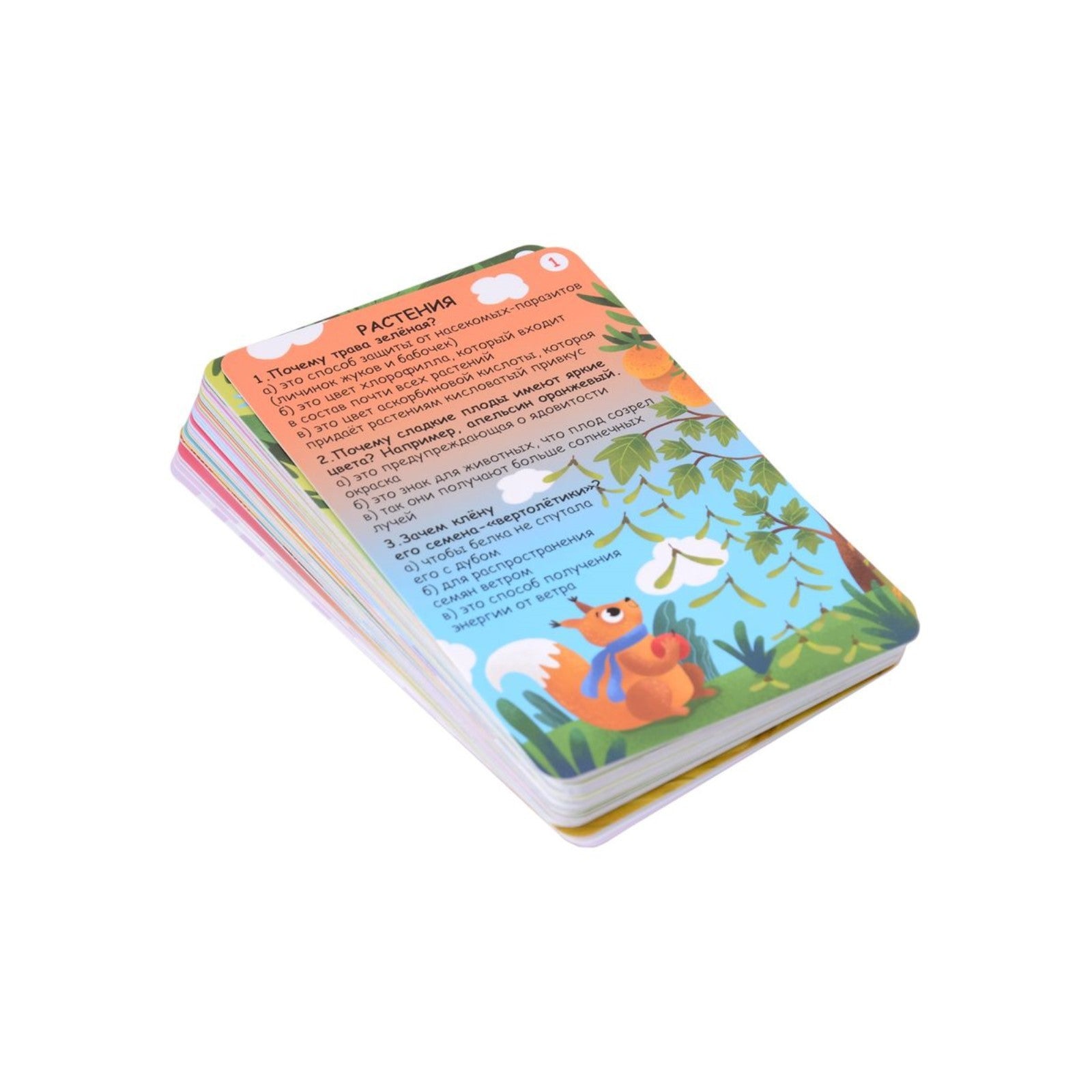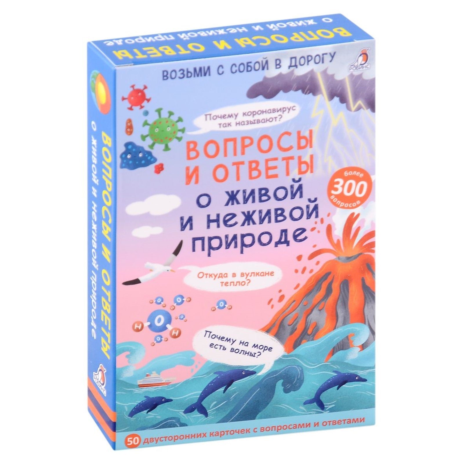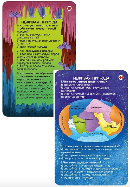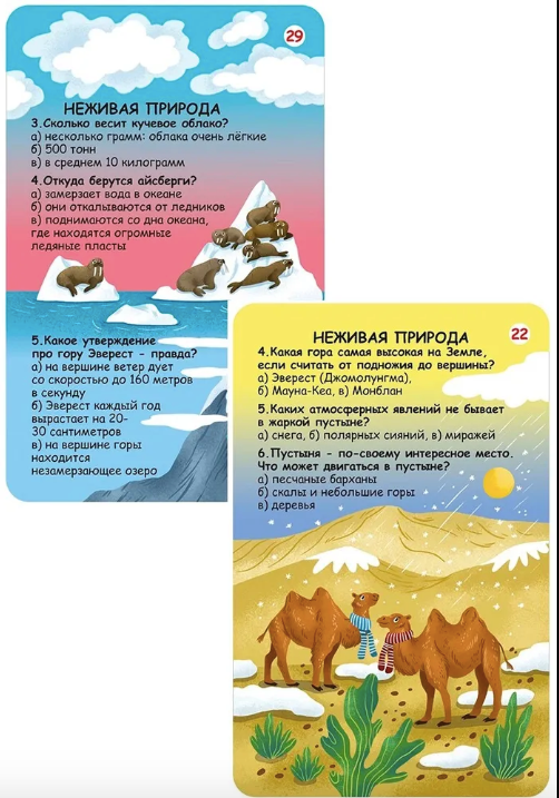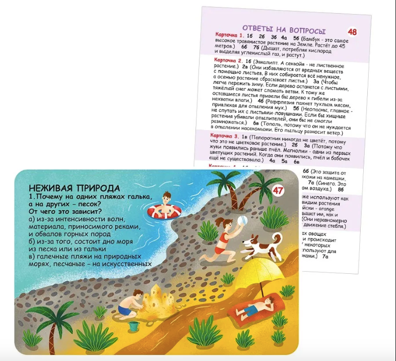 В набор входят 50 двусторонних многоразовых карточек с вопросами и ответами на самые часто задаваемые и необычные вопросы об окружающем мире.