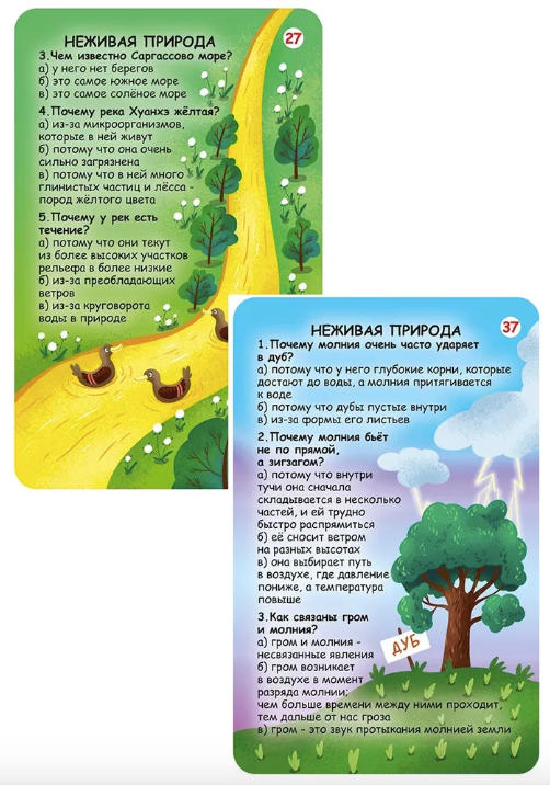 Играя с карточками, ребенок узнает интересные факты о растениях, грибах, природных явлениях, микромире, живой и неживой природе, а также будет развивать память, внимание, логику, мышление и другие важные навыки.
