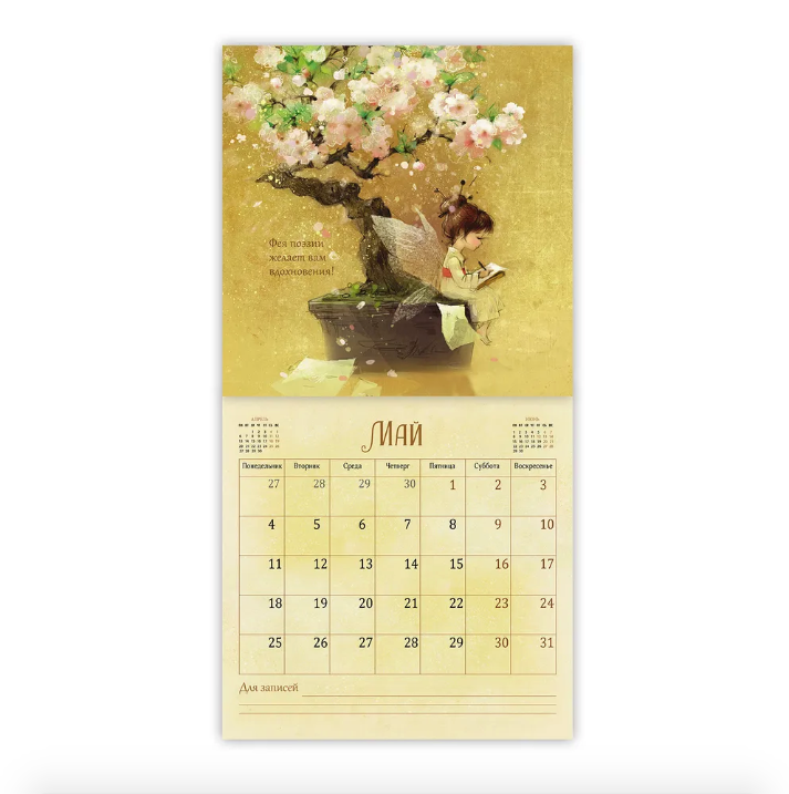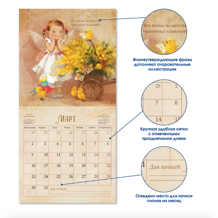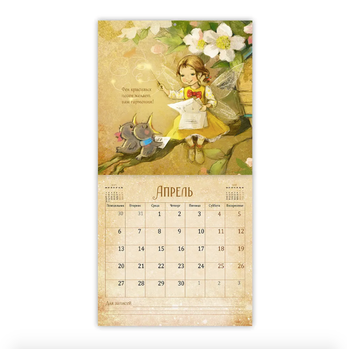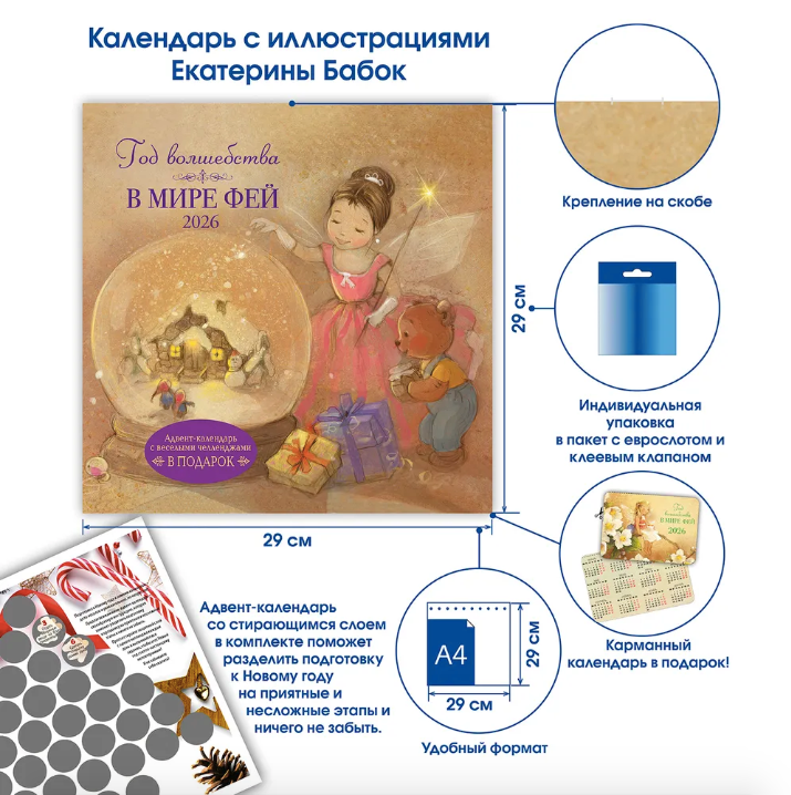 Трогательные феи популярной художницы Екатерины Бабок несут на своих крылышках наилучшие пожелания и спешат поделиться ими с вами! Этот уютный календарь с авторскими иллюстрациями как по волшебству наполнит дом счастьем, теплом и положительными эмоциями. В нем вы с удовольствием будете отмечать важные события и строить чудесные планы для исполнения всех своих желаний. На задней обложке подарок-сюрприз: карманный календарь, который можно вырезать.