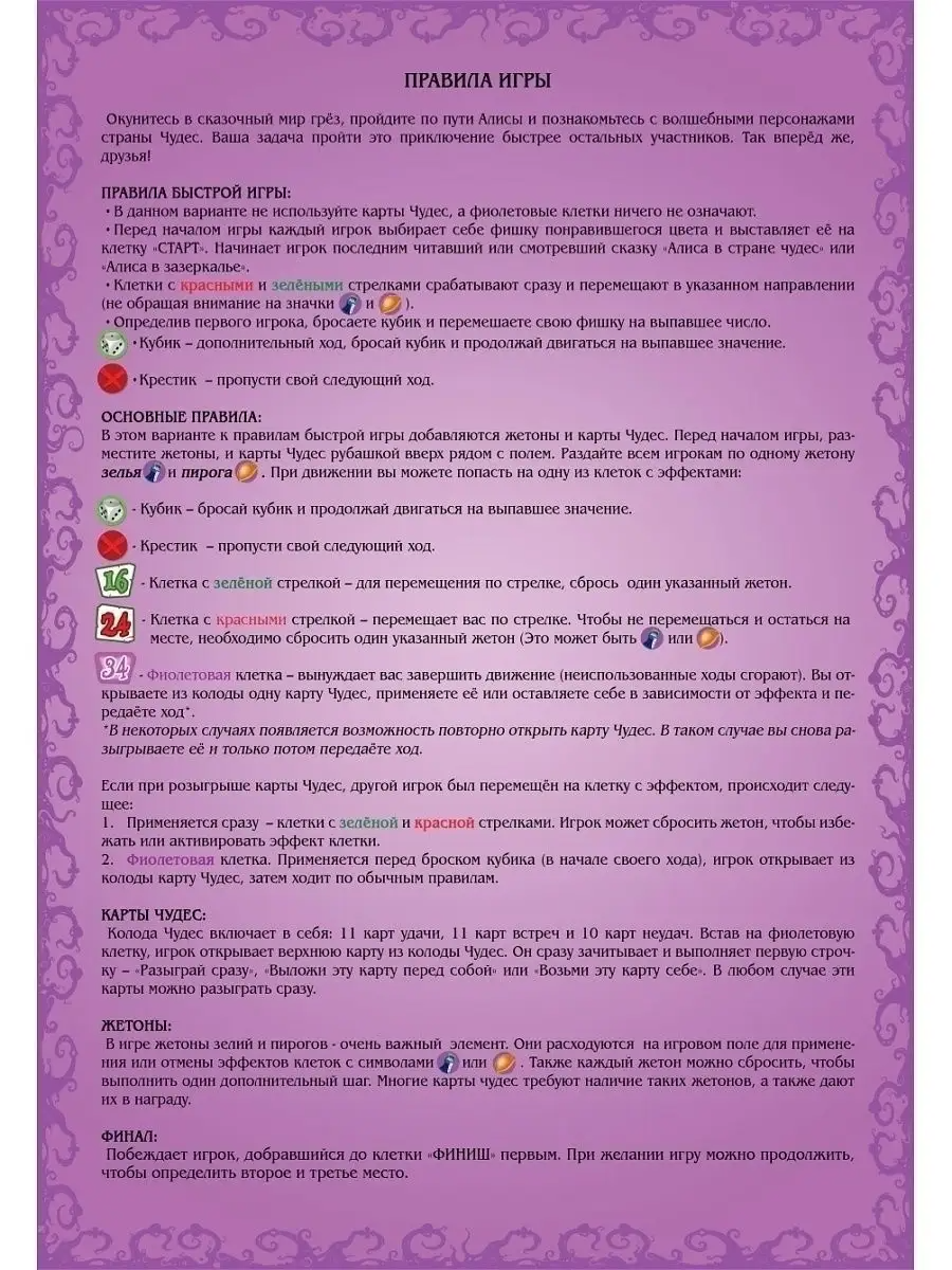 Развивающая настольная игра " Алиса в стране чудес" – это увлекательное путешествие в мир фантазии и волшебства для детей и их родителей. Игра на основе всемирно известной книги. Игра представляет собой бродилку с карточками и артефактом, предназначенную для семейного отдыха и общения. Большое количество дополнительных карточек. Огромное поле, яркий, красочный дизайн.