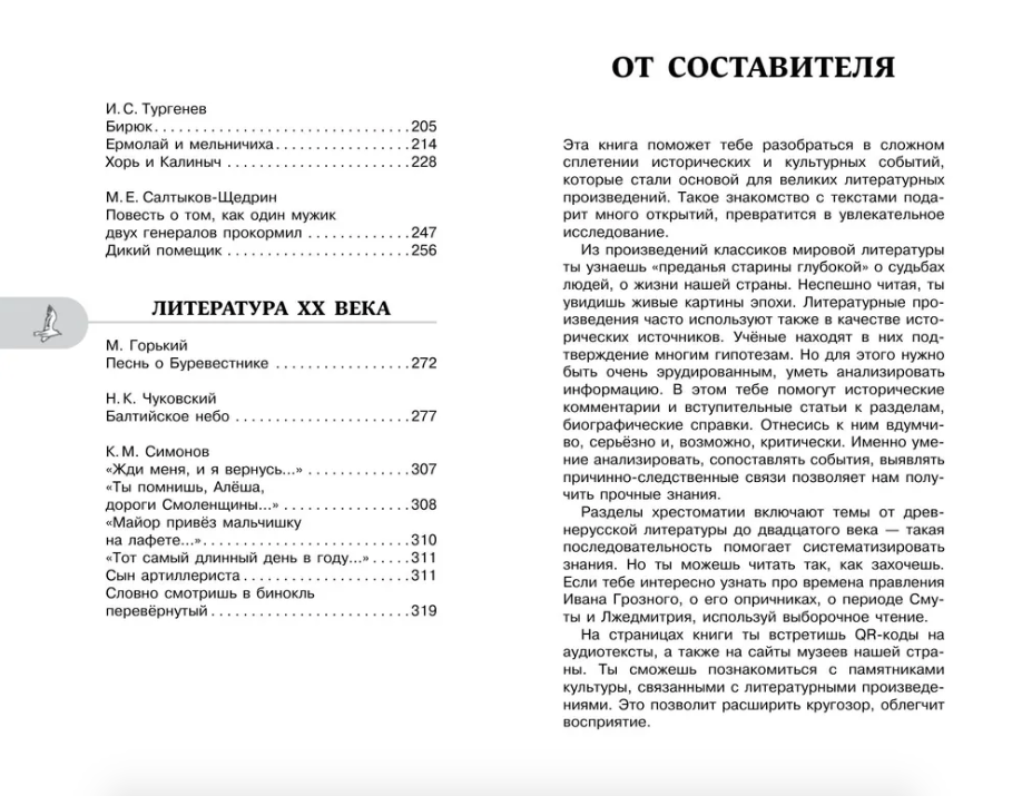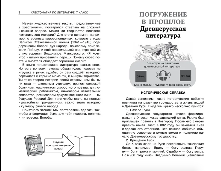 Как помочь школьнику быстро и легко освоить программу по литературе? Какой должна быть современная хрестоматия? Новейшая хрестоматия для 7 класса - это уникальный интерактивный формат, который совмещает две книги под одной обложкой. В хрестоматию вошли произведения из золотого фонда мировой литературы: А.С. Пушкина, М.Ю. Лермонтова, Н.А. Некрасова, М. Горького, М.А. Шолохова и многих других выдающихся писателей. Все произведения отобраны в соответствии с программой по литературе для средней школы. Полные аудиоверсии произведений доступны по QR-коду. Составитель хрестоматии Марина Бастрыгина, учитель русского языка и литературы, суперфиналист конкурса «Педагоги года Москвы — 2023», полуфиналист Всероссийского конкурса «Классная тема!», дополнила каждый раздел краткими статьями о связи истории и литературы. Также по QR-кодам доступны дополнительные материалы, которые познакомят юного читателя с культурным наследием, помогут расширить кругозор и привить любовь к литературе.