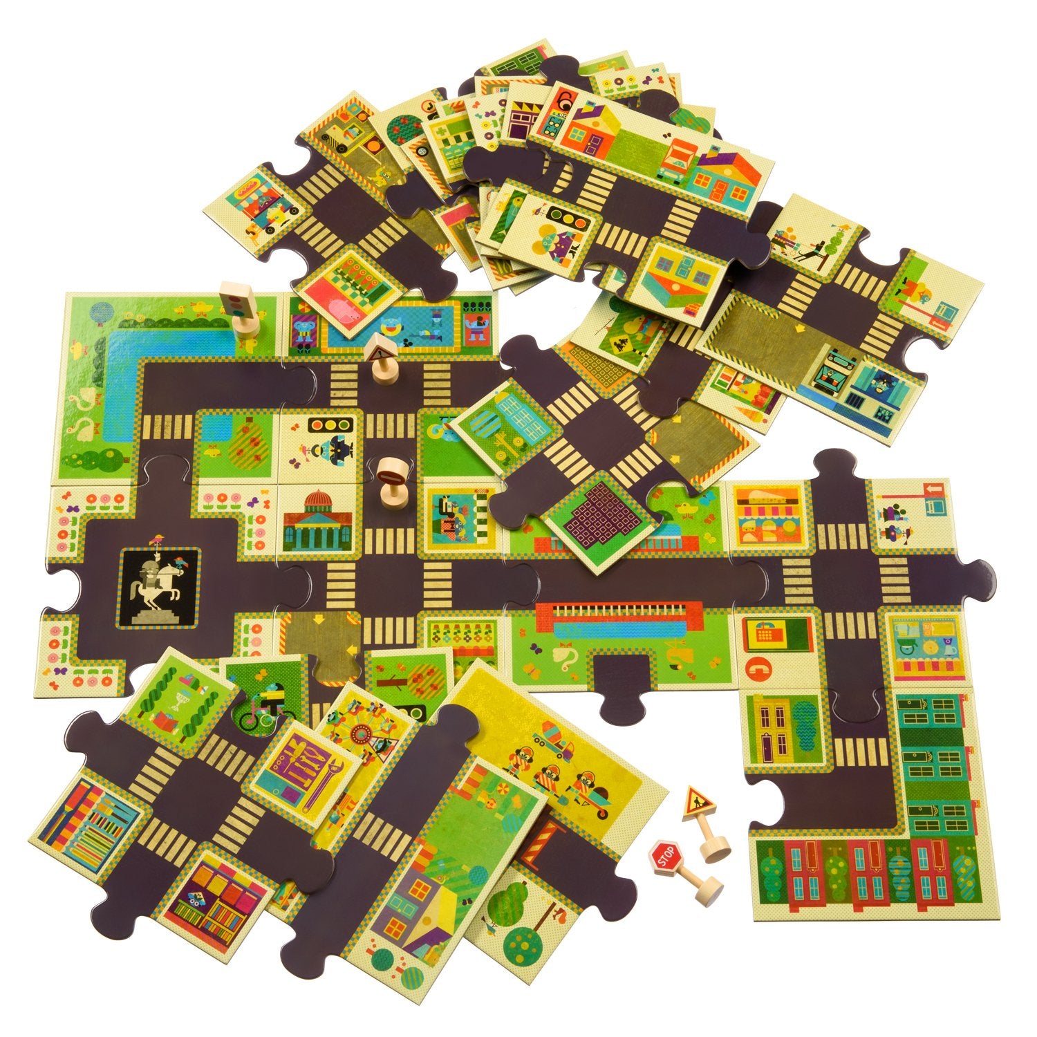 Можно собирать дорогу в любом направление и в любой конфигурации, а потом устроить на получившимся полотне увлекательную игру с машинками.