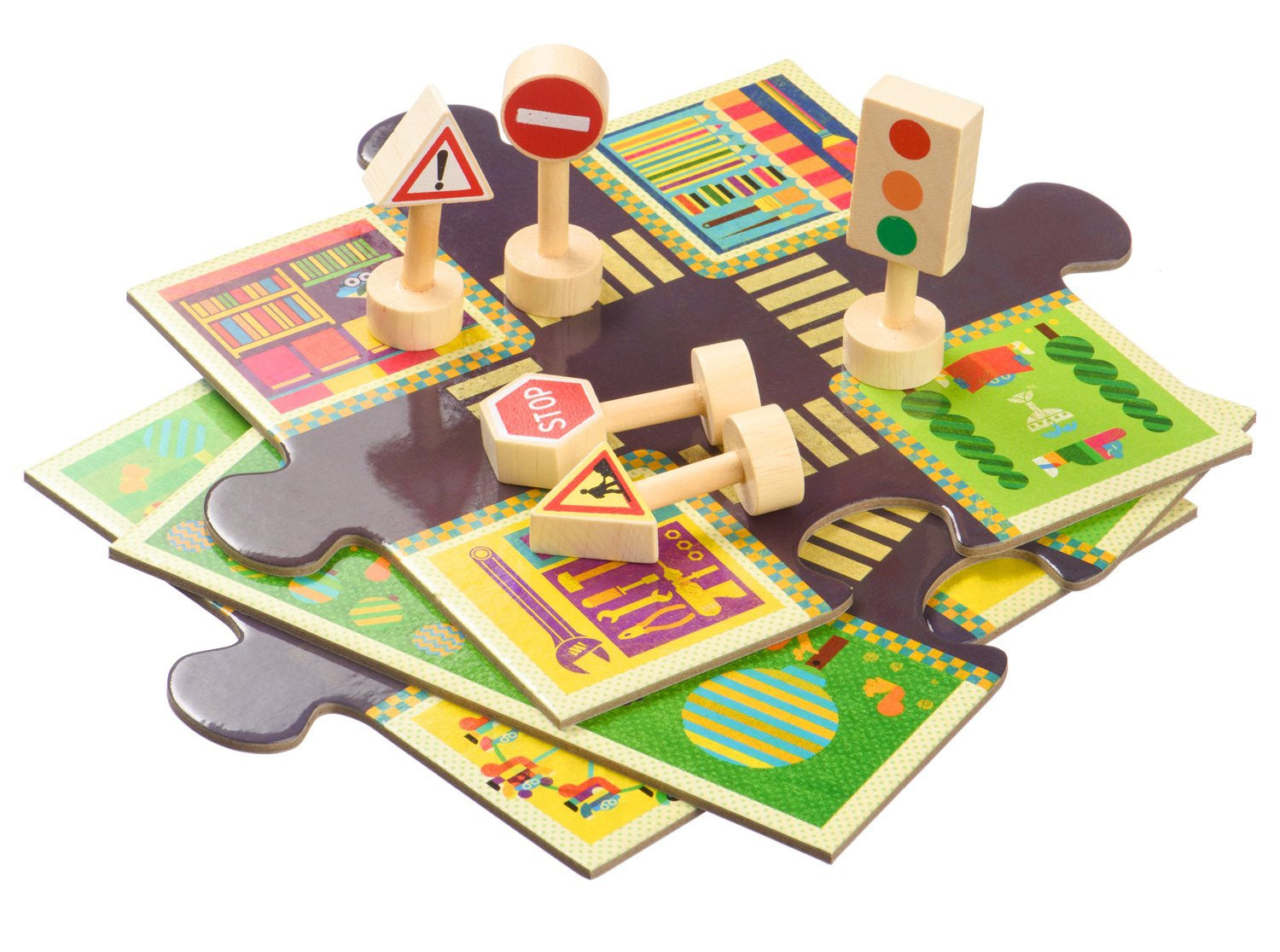 В наборе: 24 детали пазла и 5 деревянных дорожных знаков.