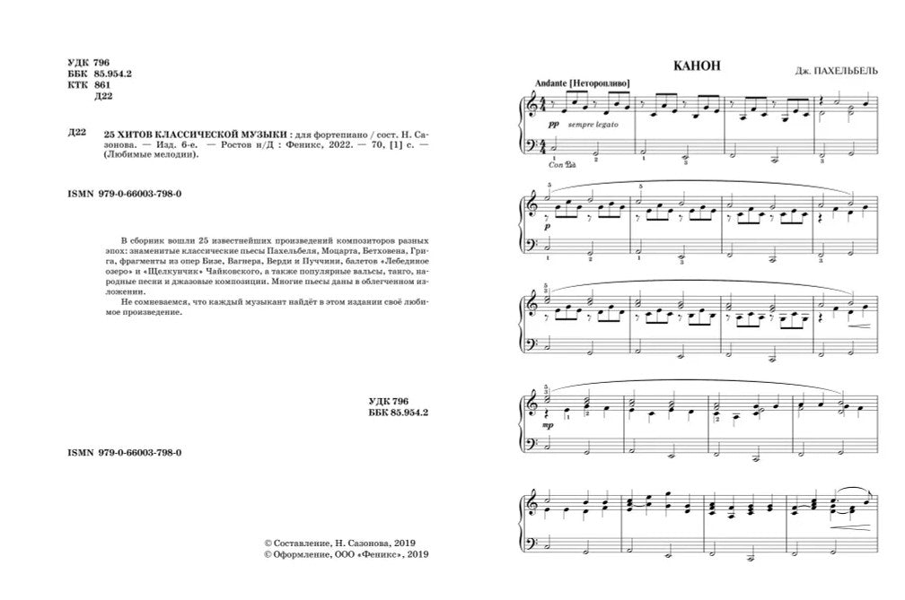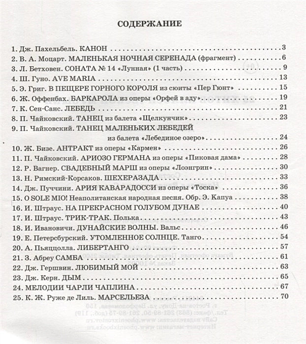 В сборник вошли 25 известнейших произведений композиторов разных эпох: знаменитые классические пьесы Пахельбеля, Моцарта, Бетховена, Грига, фрагменты из опер Бизе, Вагнера, Верди и Пуччини, балетов "Лебединое озеро" и "Щелкунчик" Чайковского, а также популярные вальсы, танго, народные песни и джазовые композиции. Многие пьесы даны в облегченном изложении.