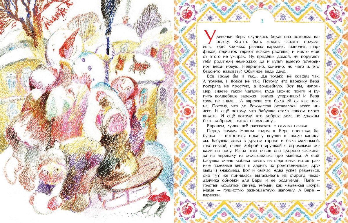 У девочки Веры случилась беда - она потеряла варежку. Кто-то скажет: подумаешь, горе! Сколько разных варежек теряют всякие растяпы. Но варежку Вера потеряла не простую, а волшебную. И она была ей очень нужна. Потому, что до Рождества оставалось всего ничего. И еще потому, что бабушка стала совсем плохо видеть. И еще потому, что добрые дела не должны быть добрыми только наполовину… Впрочем, лучше прочтите всё с самого начала.