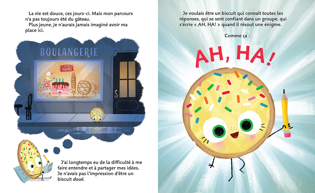 Malgré tous ses efforts, l’école n’a jamais été facile pour ce biscuit, qui n’a pas le sentiment d’être doué en comparaison avec ses camarades. Puis un jour, son enseignante lui donne un devoir qui va tout changer : le biscuit doit créer quelque chose d’original et l’apporter en classe le lendemain. Un soupçon de créativité et une pincée de confiance en soi suffiront-ils à lui faire comprendre que les notes parfaites et les bonnes réponses ne sont pas les seuls ingrédients de l’intelligence?