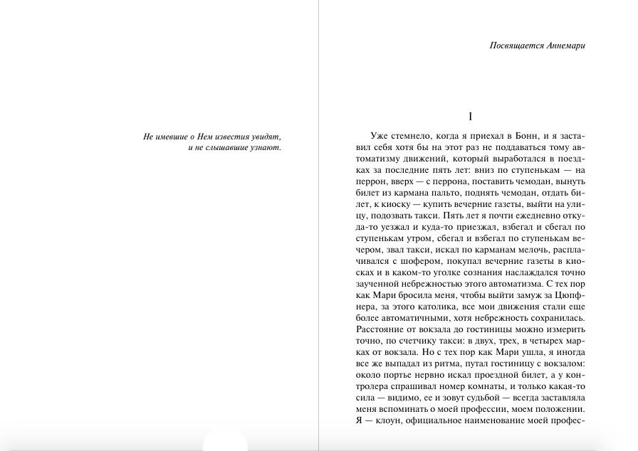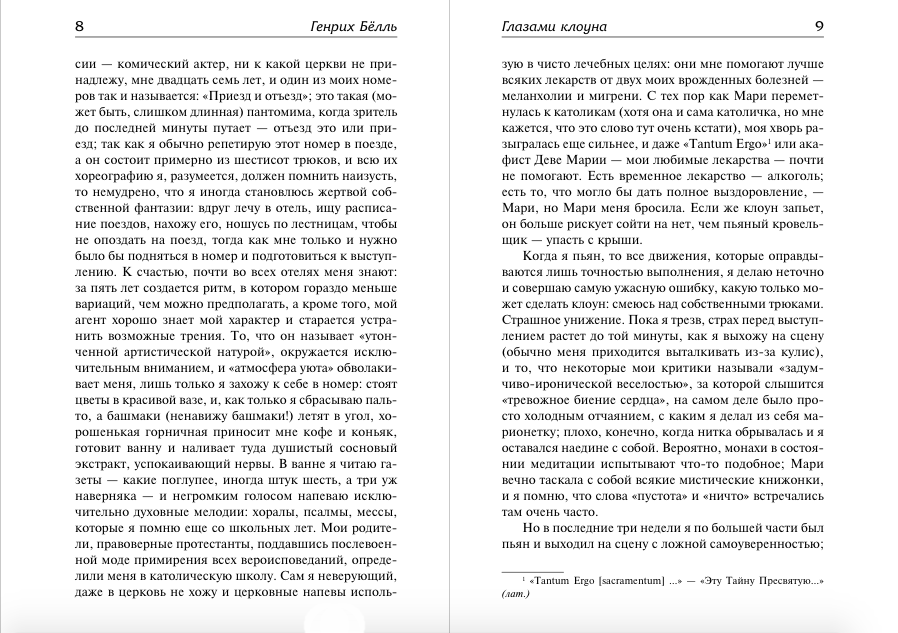 "Я клоун и собираю мгновения", - говорит о себе Ганс Шнир, нищий артист, "свой среди чужих, чужой среди своих", блудный сын богатого общества крупных буржуа, герой одной из лучших, самых пронзительных и горьких европейских книг ХХ века.