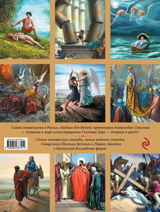 Пересказ Священного Писания Ветхого и Нового заветов в изложении протоиерея Александра Соколова считается классическим и наиболее удачным вариантом приобщения детей к вечным ценностям христианства. Библейские сюжеты отобраны Соколовым бережно и внимательно - как сделать может только духовное лицо. Важнейшие события священной истории описаны языком, понятном ребенку, в них вплетены неназойливые поучения и советы. При этом каждая история может быть использована родителями или учителями для беседы с подрастающим поколением о смысле жизни, о правде и лжи, о вере и неверии и других важных вопросах. Особую прелесть книге придают и эпизоды неканонических книг, а также истории из области церковного предания: например, о детстве Богородицы, о молодых годах Иисуса Христа, о крещении Руси апостолом Андреем Первозванным. Это издание Библии - самое красочное и иллюстрированное среди всех, вышедших в России. Впервые в мире классические, непревзойденные иллюстрации Гюстава Доре предлагаются в цветном исполнении! Качественный переплет, уникальные иллюстрации, прекрасный текст и большой формат книги делают эту детскую Библию прекрасным подарком для ребенка, для семейной библиотеки, а также для занятий в воскресных школах.