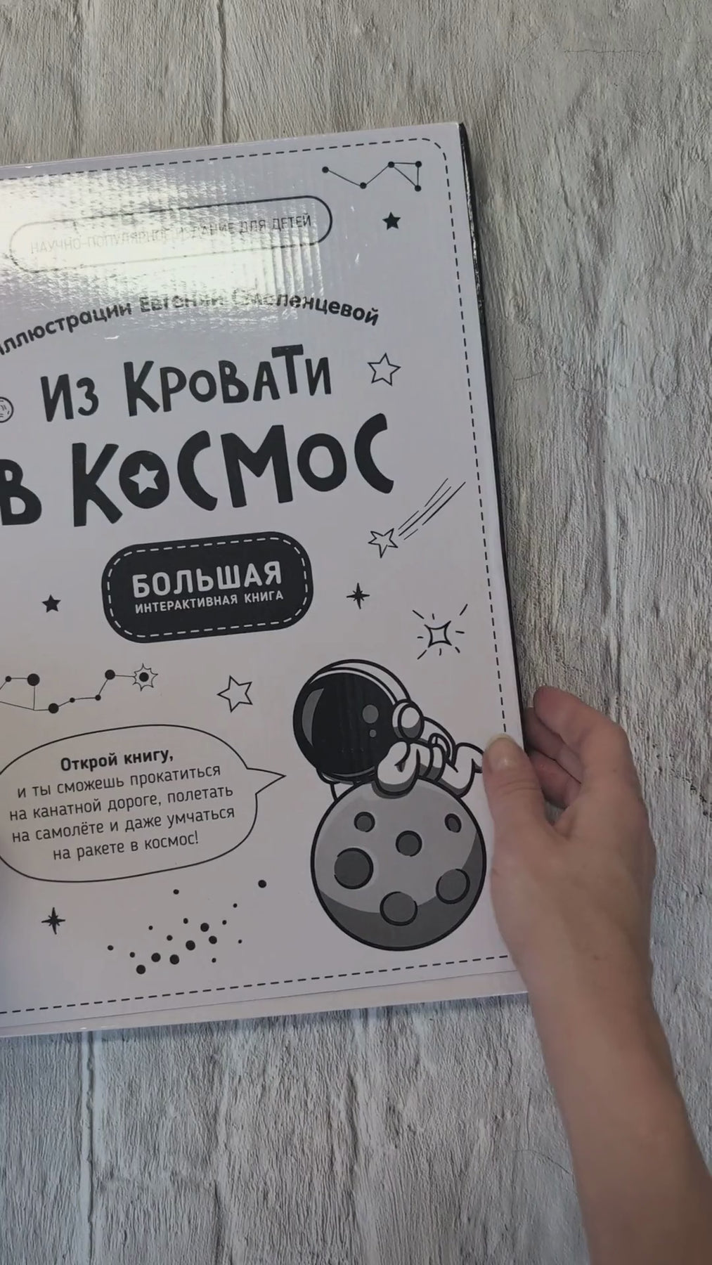 Почему небо голубое? А как появляются гром и молния? Что будет, если заплакать в космосе? На эти и другие вопросы малыш найдет ответы в познавательной книжке-раскладушке «Из кровати в космос». 46 занимательных фактов о Солнечной системе изложены доступным языком, адаптированным для детей. В этой книжке вы найдёте 46 интерактивных окошек и тактильные ползунки. Интерактивные окошки абсолютно разные, например, у кометы есть объемный хвост. К игре на обратной стороне книги прилагаются кубик и фигурки.