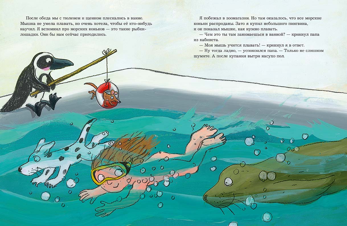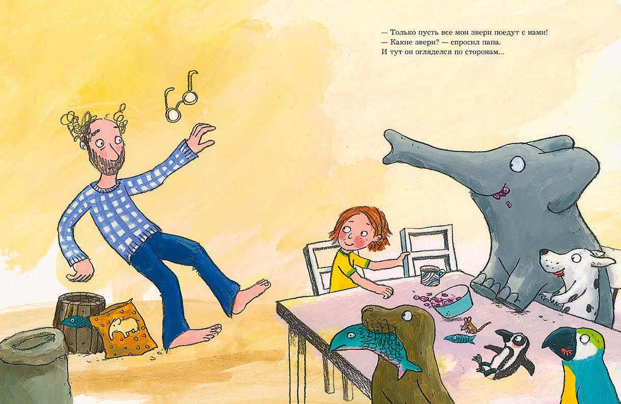 И вот, когда к воскресенью папа, наконец, закончил свой важный проект и огляделся по сторонам, он обнаружил, что за столом на кухне сидит и завтракает большая дружная компания: Мика с мышкой-песчанкой, щенок, тюлень, пингвин, попугай и слонёнок.