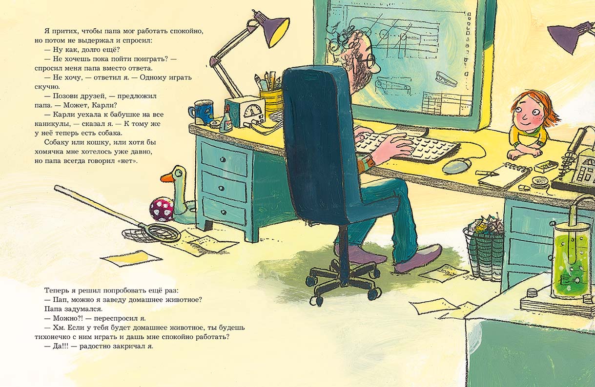 Мика просит разрешения завести себе домашнее животное, чтобы было с кем провести время, пока папа занят. Немного подумав, папа даёт Мике своё согласие и кошелёк, с которым мальчик отправляется в зоомагазин. Там Мика покупает себе мышку-песчанку. И они отлично играют в прятки по всей гостиной. Правда, потом мышка прячется так хорошо, что Мика снова идёт в зоомагазин и на этот раз возвращается со щенком, потому что у собак отличный нюх, и они могут отыскать кого угодно. Ну а дальше… дальше Мике пришлось сбегать в зоомагазин ещё несколько раз.