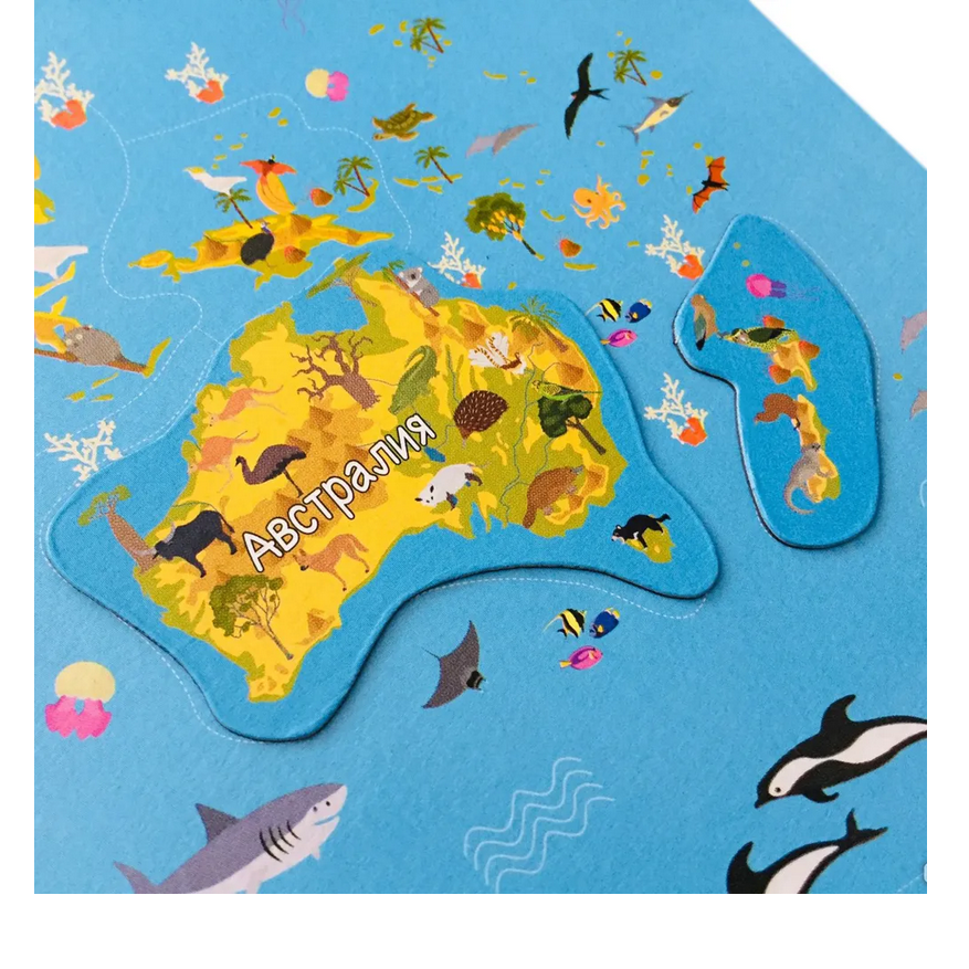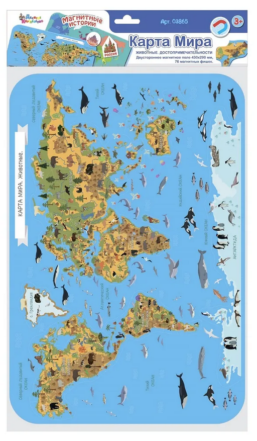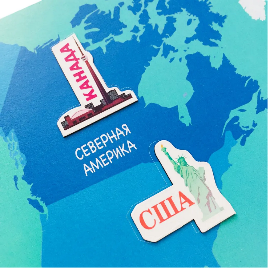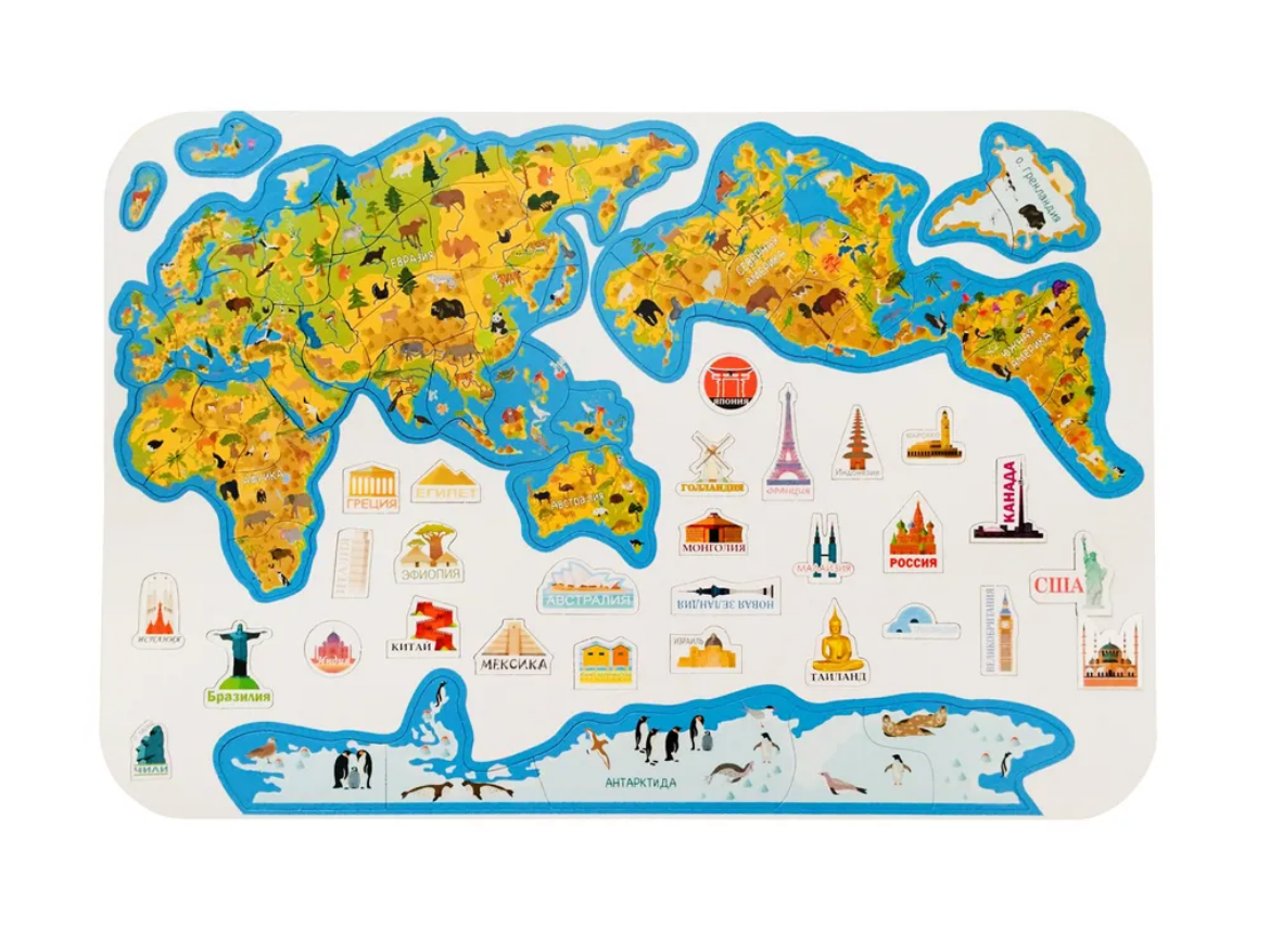 Эта магнитная развивающая игра познакомит ребёнка не только с континентами и странами, но также с их обитателями и важнейшими природными или историческими достопримечательностями планеты.
