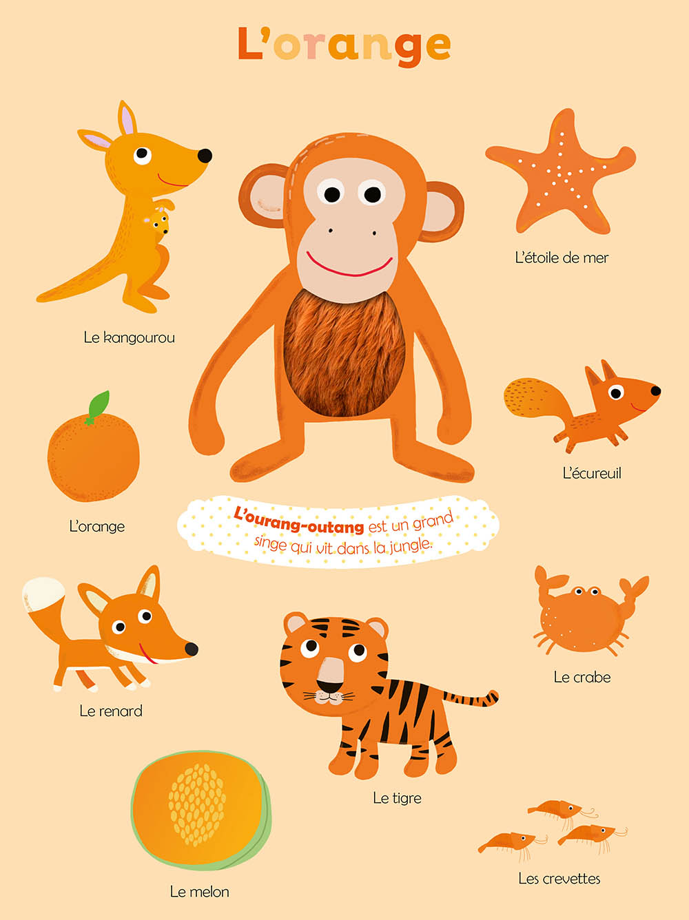 L'enfant découvre ses premières couleurs tout en douceur, grâce à des univers simples et adaptés. À chaque page, le tout-petit peut toucher un bel élément et en nommer de nombreux autres. Plus de 20 matières viennent participer à l'éveil de l'enfant.
