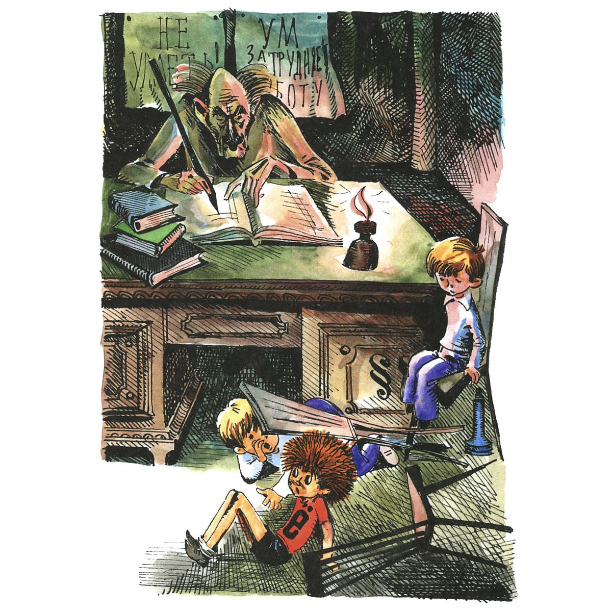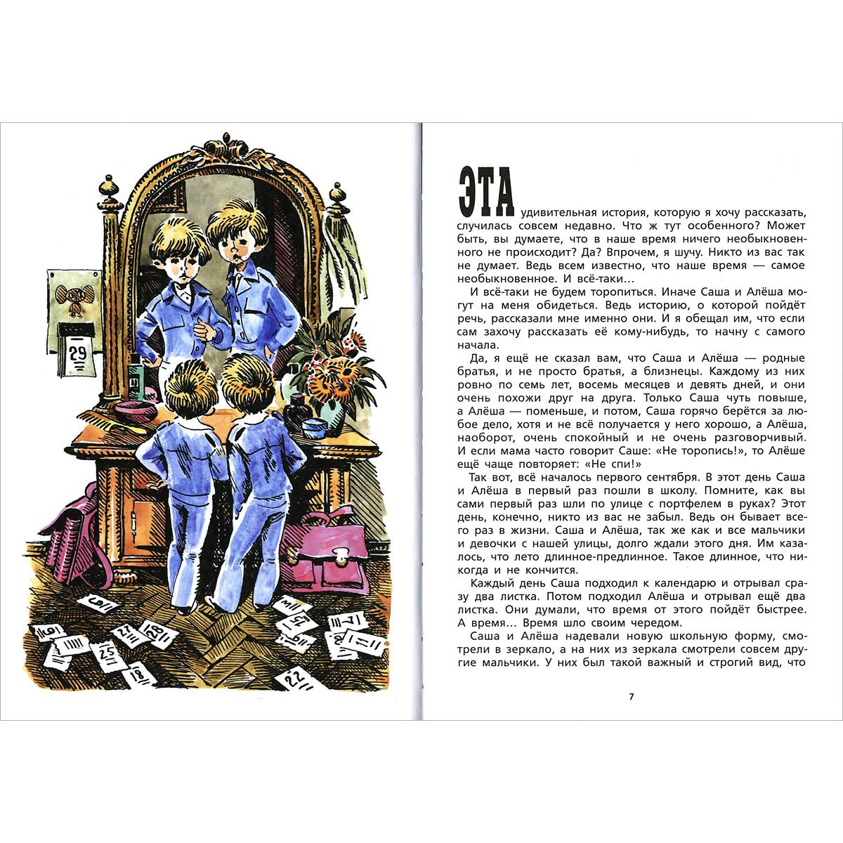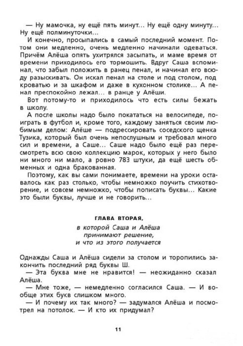 Саша и Алёша - близнецы, им семь лет и они очень похожи друг на друга. Всё лето, надев школьную форму, близнецы любовались своим отражением в зеркале и думали о том, что скоро, очень скоро у них начнётся новая жизнь. Но они совсем не догадывались, какие приключения их ожидают. Всё началось сразу после первого сентября, когда Саша и Алёша в первый раз пошли в школу. Теперь им приходилось подниматься рано по утрам, собирать портфели и делать уроки. И если с первыми двумя задачами они ещё как-то справлялись, то домашние задания были самой настоящей бедой. Конечно, попробуй тут усиди, когда эти настырные палочки-крючочки никак не хотят складываться в буквы! Лучше бы этих букв совсем не было!