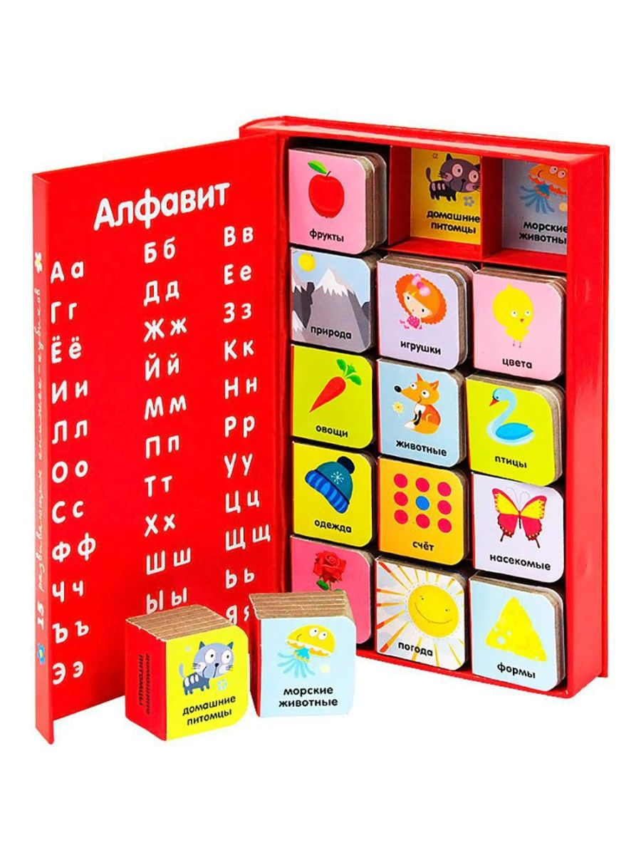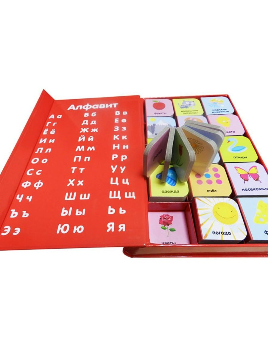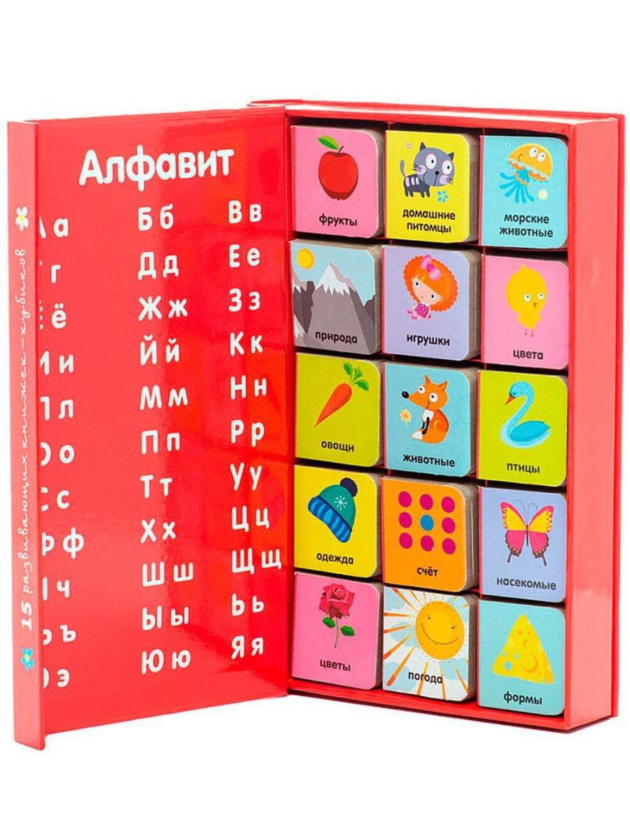 Книжки-кубики - уникальное пособие для развития мелкой моторики, знакомства с окружающим миром и начала изучения первых слов в раннем возрасте ребенка. Тщательно отобрав 15 интересных и познавательных тем, наши психологи и педагоги создали книжки-кубики для малышей. Одежда, цвета, животные, фрукты и многое другое - все базовые темы для развития интеллекта малыша, теперь в одной коробке! Набор книжек из картона в форме кубиков созданы для развития речи, внимания, мелкой моторики, памяти и быстрого познания окружающего мира детьми. На внутренней стороне коробки есть алфавит русского языка. Ребенок учит буквы и слова, весело играя!