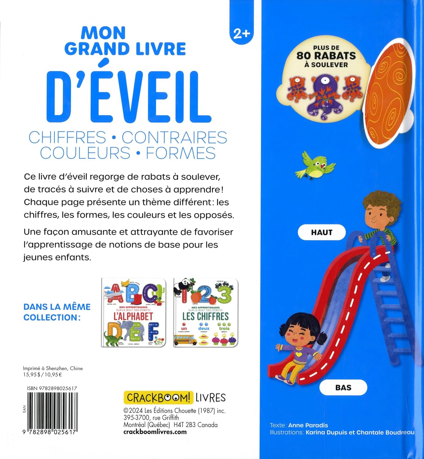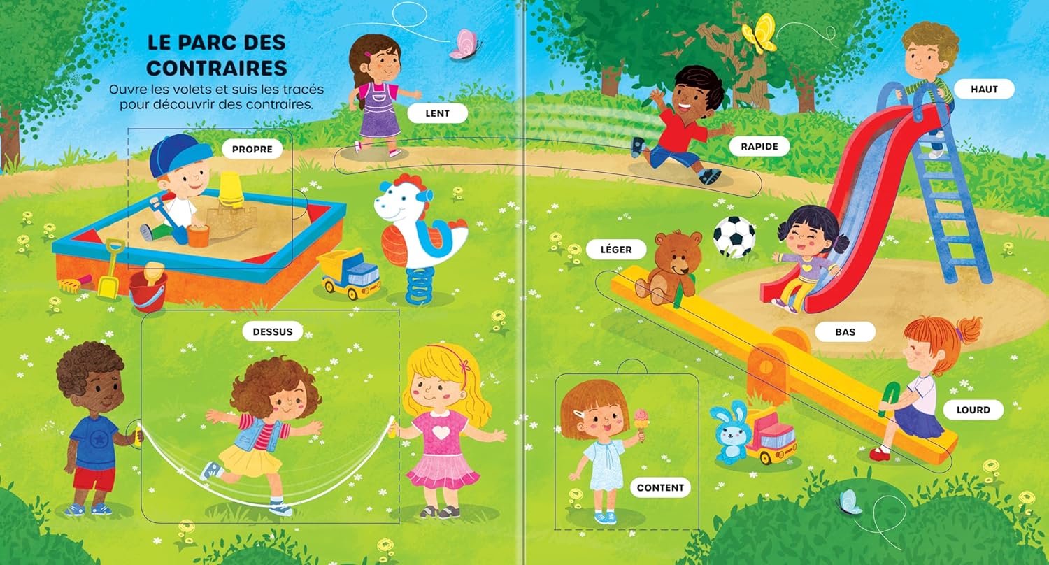 Ce livre d’éveil regorge de rabats à soulever, de tracés à suivre et de choses à apprendre! Il permet de travailler les habiletés de pré-écriture des tout-petits tout en les aidant à développer leur vocabulaire. Chaque page interactive présente un concept de base différent : les chiffres, les formes, les couleurs et les opposés. Les rabats et les tracés sont une façon amusante et attrayante de favoriser l’apprentissage précoce aux jeunes enfants.
