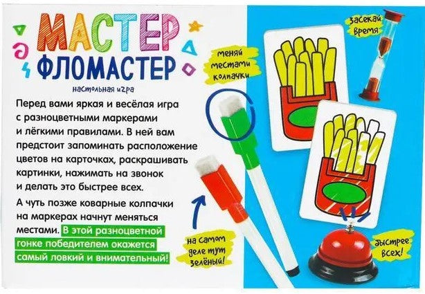 Перед вами яркая и весёлая настольная игра «Мастер-фломастер» с разноцветными чудо-фломастерами и лёгкими правилами.