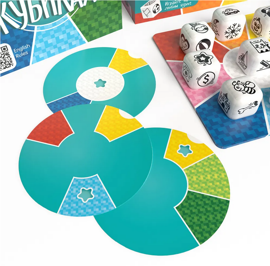 В комплекте 9 качественных кубиков, на которых 54 разные картинки-иконки. А это более 1200 разных возможных сочетаний пар, которые нужно объединять ассоциациями! Кубики ставятся в слоты на игровом поле с цветными секторами, а игровое поле удобно размещается прямо в коробке – можно играть на пикнике или в вагоне поезда!