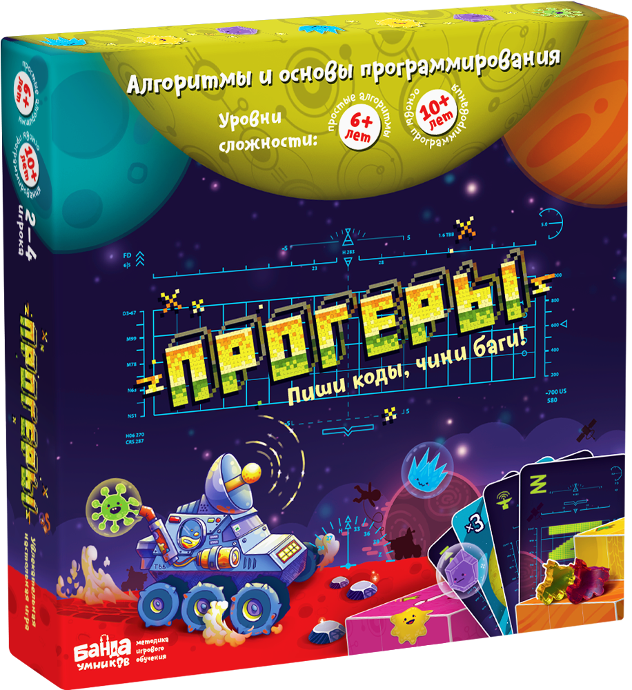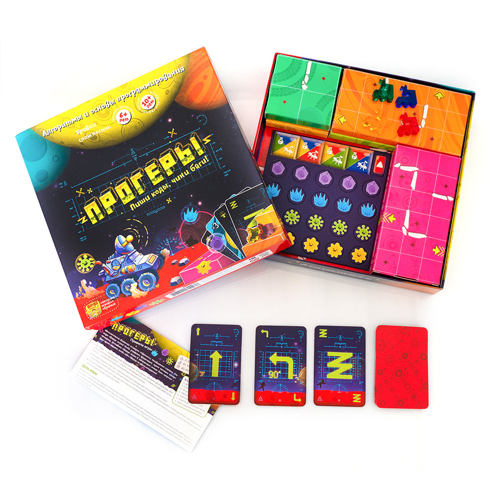 Программирование — штука сложная, и с разбега на неё не запрыгнешь! Поэтому в «Прогерах» игроки постепенно проходят путь от простых алгоритмов к более сложным. Играть можно с 6 лет — для этого предусмотрен простой вариант правил. А для ребят постарше и их родителей есть основной вариант игры с более сложным полем и азартными правилами. Многоэтажная 3D-настольная игра на алгоритмы, начало программирования и логику. Поле выстраивается из трёх блоков произвольным образом — есть тысяча вариантов, как это сделать. В игре много компонентов, увлекательная механика, сложность игры можно подстраивать под игроков. Вездеходы-исследователи перемещаются по поверхности неизведанной планеты и собирают образцы жизни. Задача — собрать больше всех образцов. Игроки программируют вездеходы, выкладывая код из карточек с шагами («вперёд», «вправо», «влево», «прыжок», «телепорт» и др.) В наборе: двустороннее игровое поле, 5 картонных блоков-холмов, 52 карты команд, 4 фигурки вездеходов, 4 жетона баз/лабораторий, 20 жетонов с образцами жизней, иллюстрированные правила.