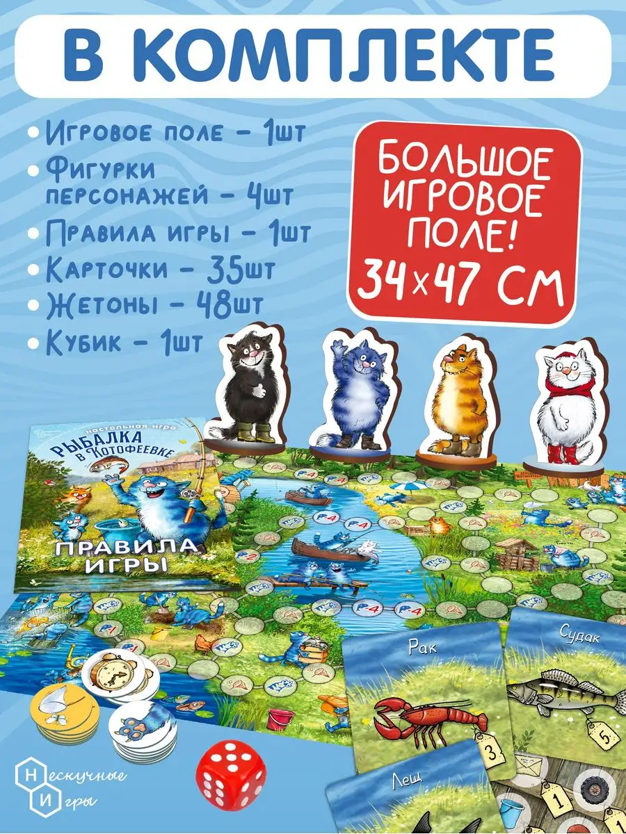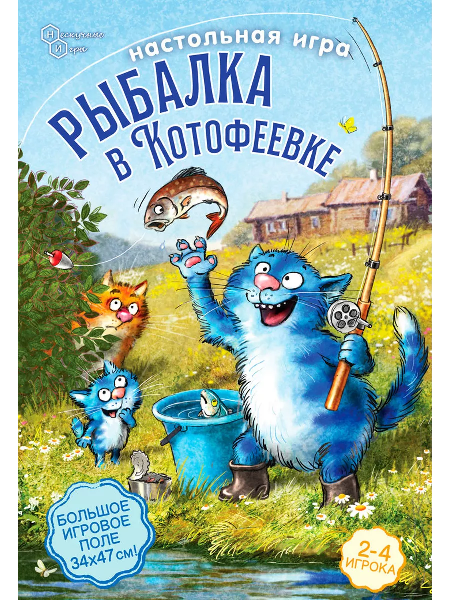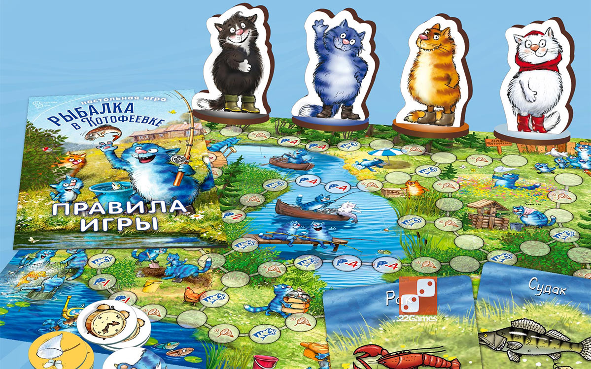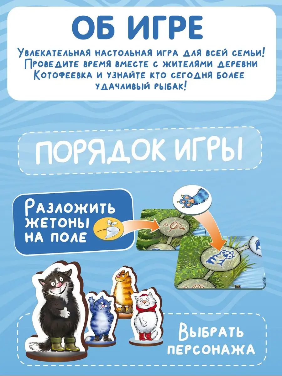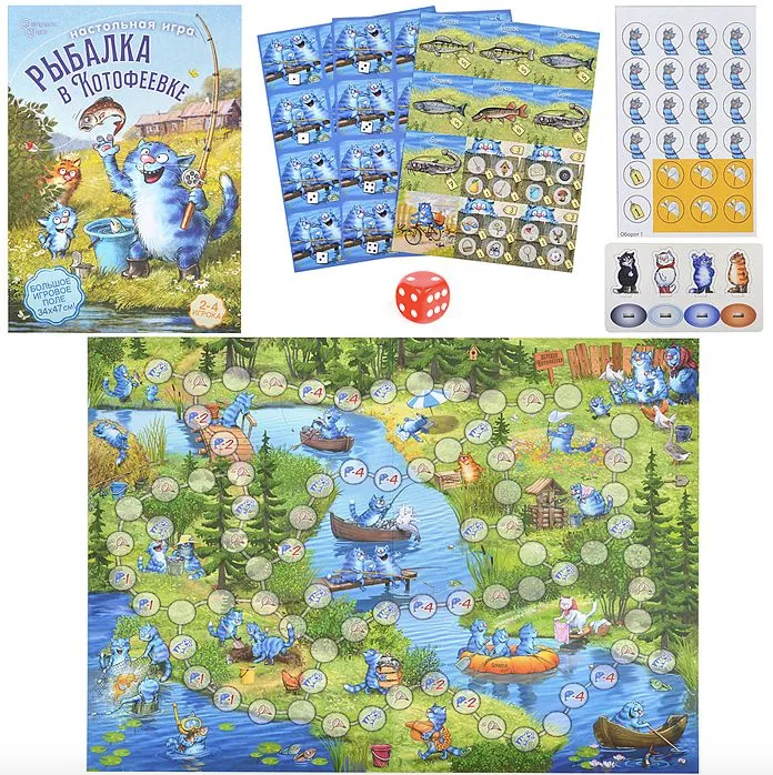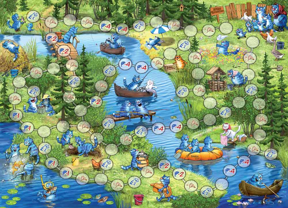 Увлекательная настольная игра для всей семьи! Интересный сюжет затянет в игру даже взрослых. Отличная семейная игра для вечерних посиделок, Игра с сюжетом и заданиями для любителей познавать новое и неизведанное. Предлагаем вам познакомиться с милыми персонажами нашей новой увлекательной игры бродилки «Рыбалка в Котофеевке», созданной на основе иллюстраций «Синие коты» Рины Зенюк. Это настоящая кошачья деревня, в которой Вы поможете котикам, не попав в ловушки, наловить как можно больше рыбок. Узнайте, кто из игроков более удачливый рыбак!