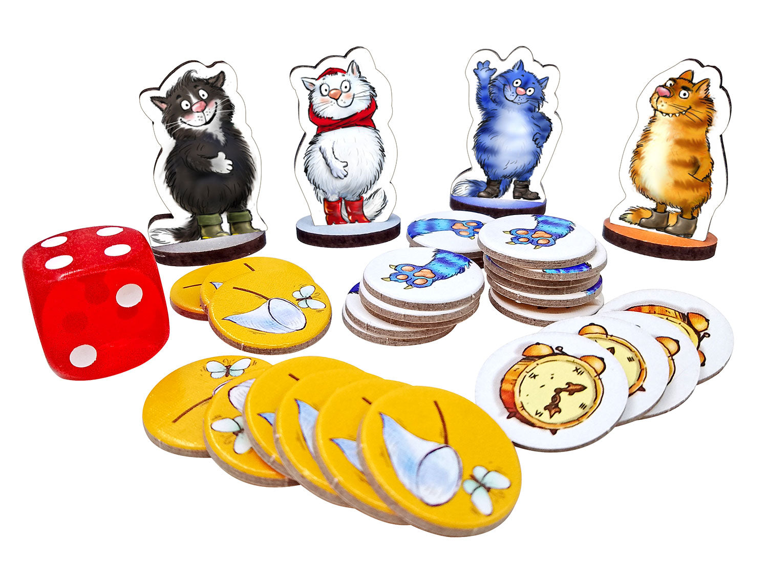 В комплекте: игровое поле; фигурки котов - 4 шт.; карточки - 35 шт.; жетоны - 48 шт. ; кубик, правила игры.