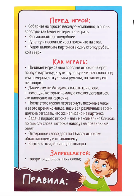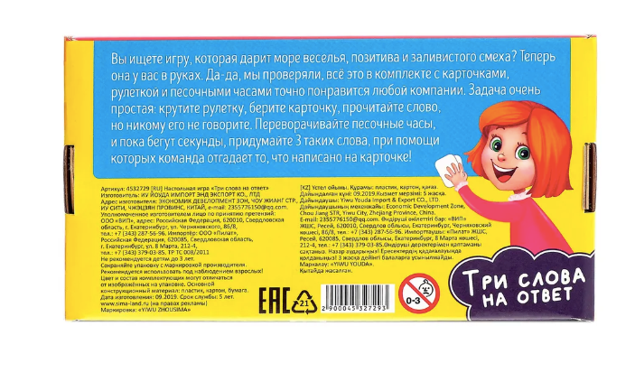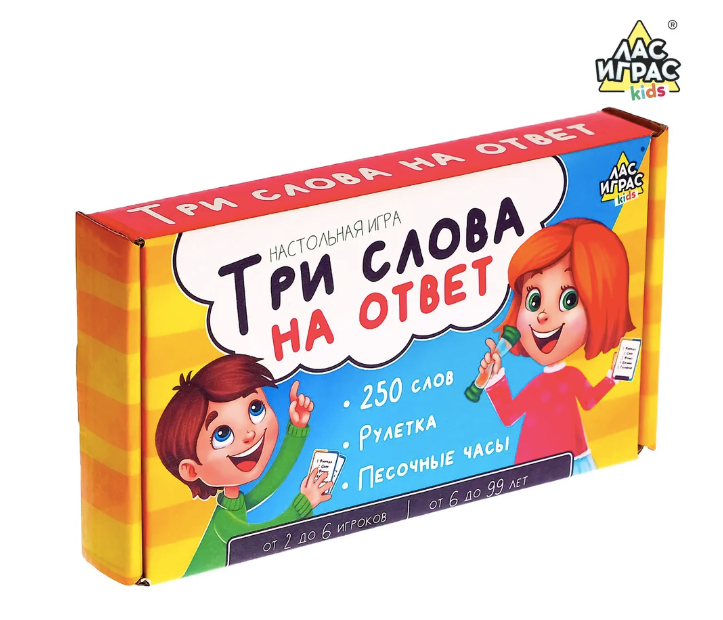 "Три слова на ответ" - командная настольная игра без ограничений по возрасту. Она порадует ваших близких на праздниках и в спокойной домашней обстановке. Правила игры просты: крутите рулетку, берите карточку, прочитайте слово, но никому его не говорите. Переворачивайте песочные часы, и, пока бегут секунды, придумайте 3 слова, с помощью которых команда отгадает, что написано на карточке. Отгаданное слово даёт по 1 баллу игрокам: объясняющему и отгадавшему. Запрещается говорить однокоренные слова. Игра "Три слова на ответ" положительно влияет на фантазию, скорость мышления, логику, внимание и память. Она раскрепощает детей и расширяет их кругозор.
