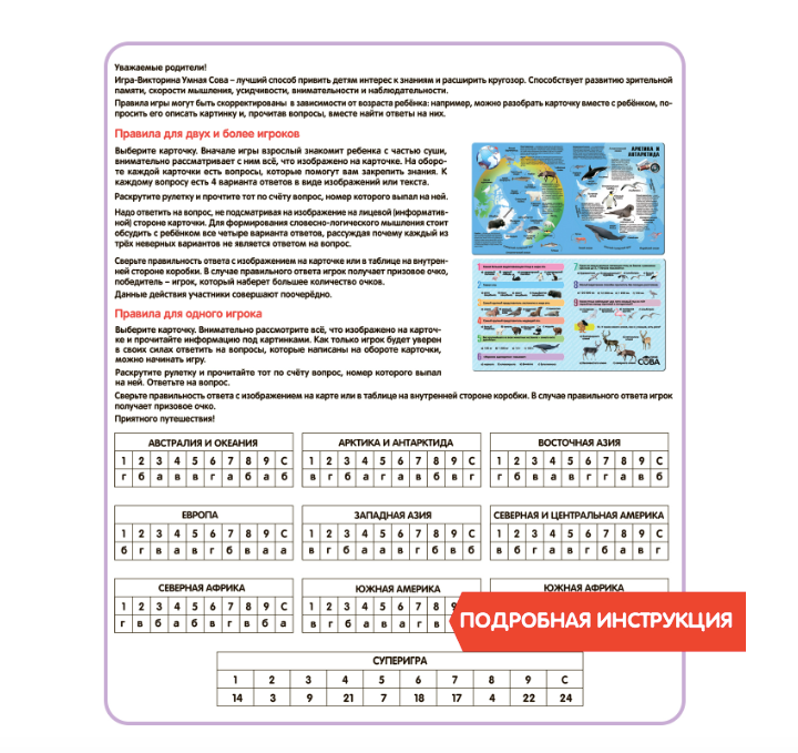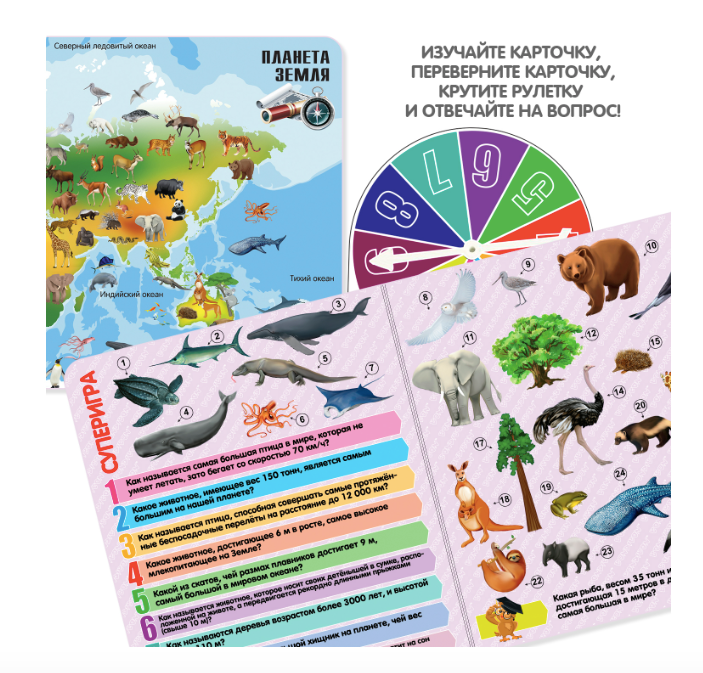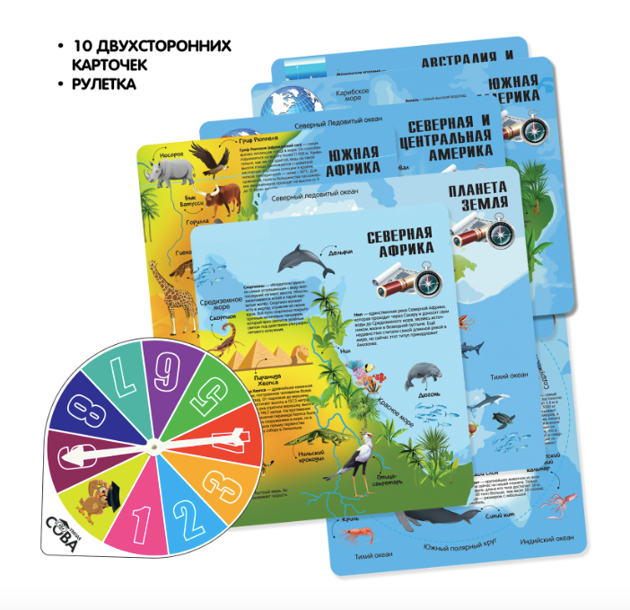 Выберите часть суши и отправляйтесь в путешествие. Рассмотрите всё, что изображено на карточке. Далее переверните карточку. На обороте есть вопросы. Раскрутите рулетку и прочтите тот по счету вопрос, номер которого выпал на рулетке. Отвечайте, не подсматривая изображение на лицевой стороне карточки.