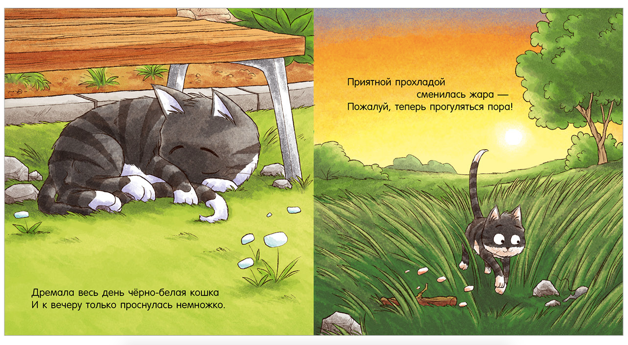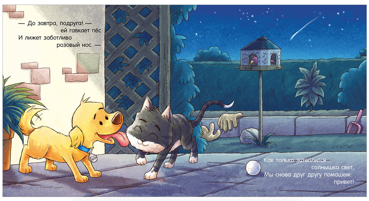 Это история про маленького симпатичного песика, который живет в большом доме. Он дружит с кошкой, которая спит днем. А еще с мышкой, которая вылезает из норки, чтобы добыть себе сыра на обед. Сам песик весело проводит день в играх с детьми. Но вот пришел вечер. Кошка только просыпается, ведь она любит гулять ночью. Щенок желает ей спокойной ночи и прощается до утра. Дети чешут песику животик перед сном. «Спокойной ночи, песик!» — чудесная вечерняя книжка, чтение которой может стать для вас прекрасным «убаюкивающим» ритуалом.