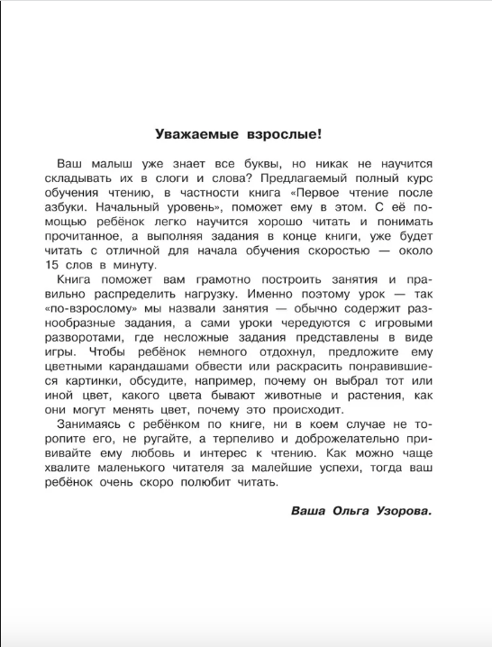 Книга «Первое чтение после азбуки. Начальный уровень» содержит различные игровые обучающие и развивающие задания, выполняя которые ребёнок легко научится складывать буквы в слоги, а слоги – в слова, читать по слогам первые простые слова, предложения и короткие тексты. Это первая книга полного курса обучения чтению - уникальной системы обучения смысловому чтению с нуля до беглого выразительного чтения.