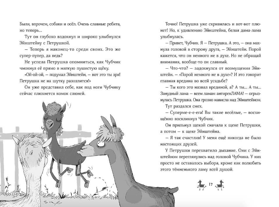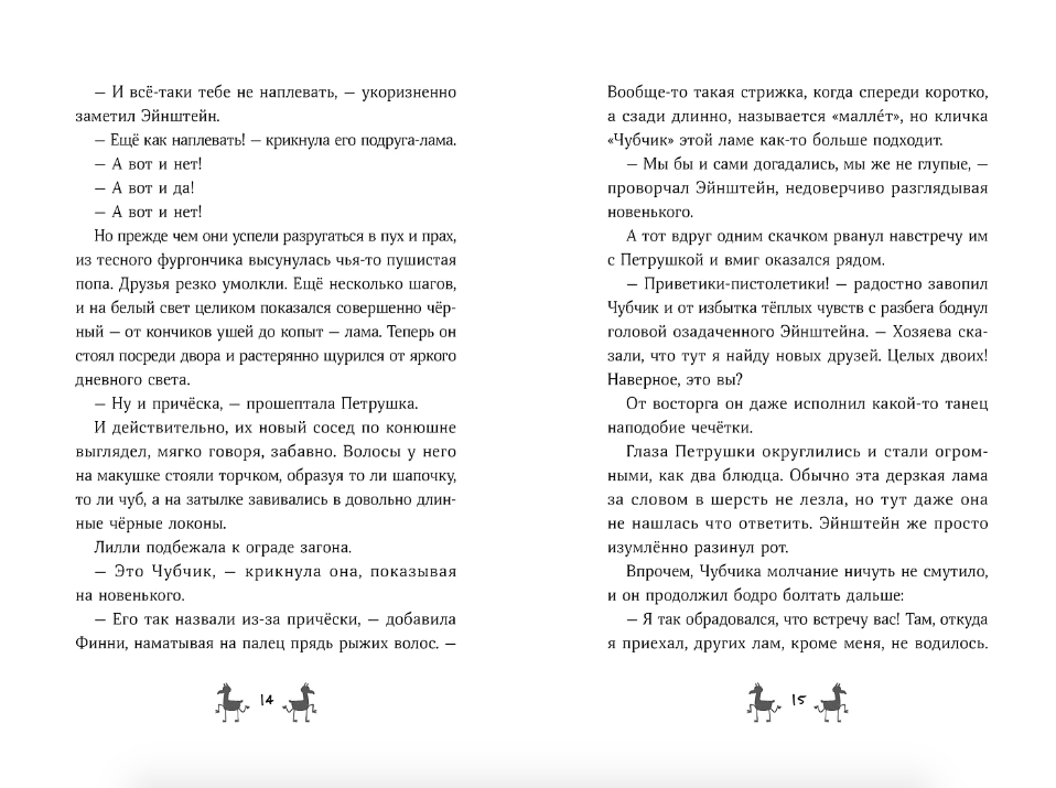 Эйнштейн — коричневая пятнистая лама, умен и рассудителен, любит спокойствие и комфорт. Петрушка — белоснежная альпака с шикарной прической; любит изображать диву. Чубчик — веселая черная лама, который получил свое имя благодаря странной прическе.