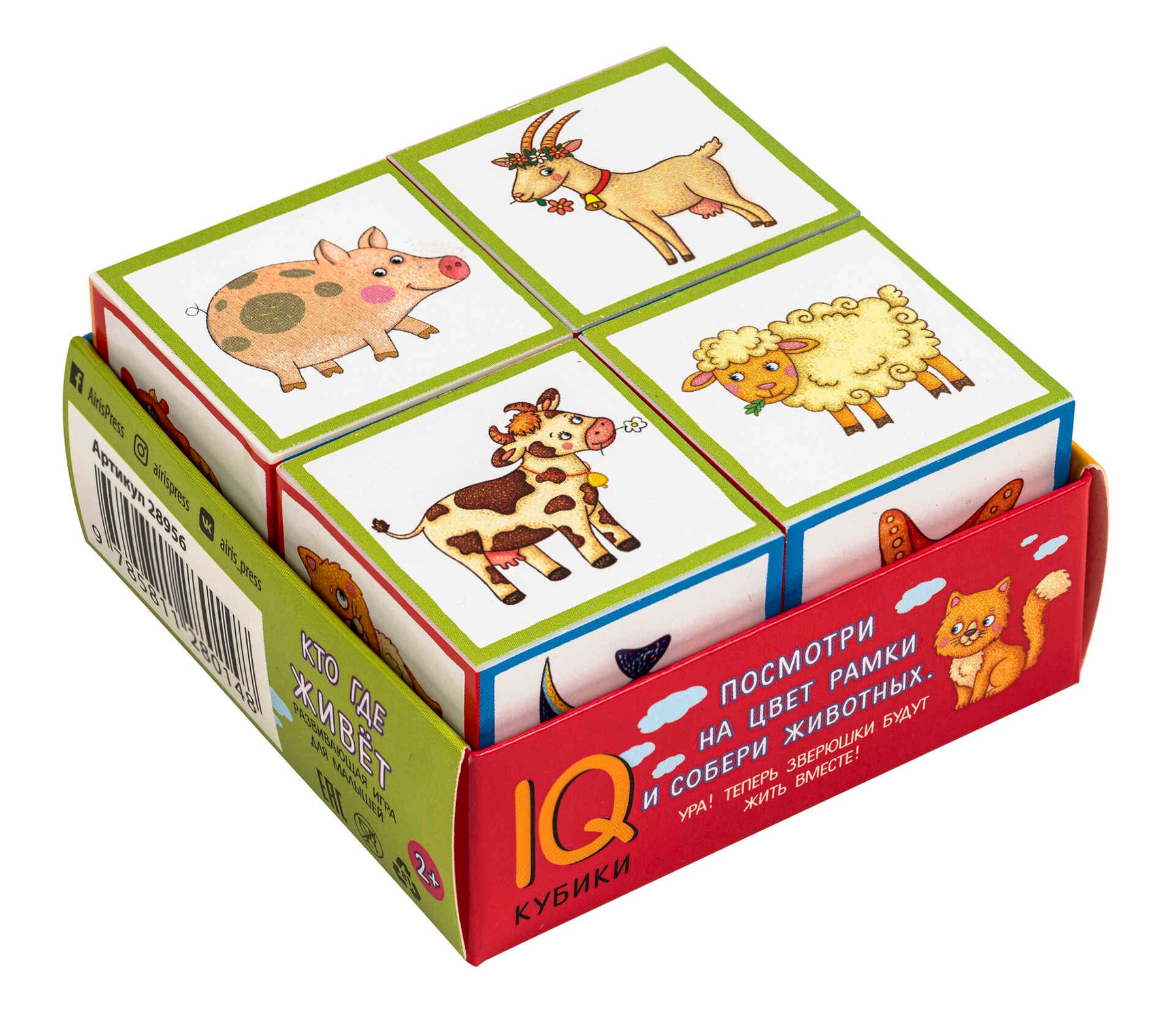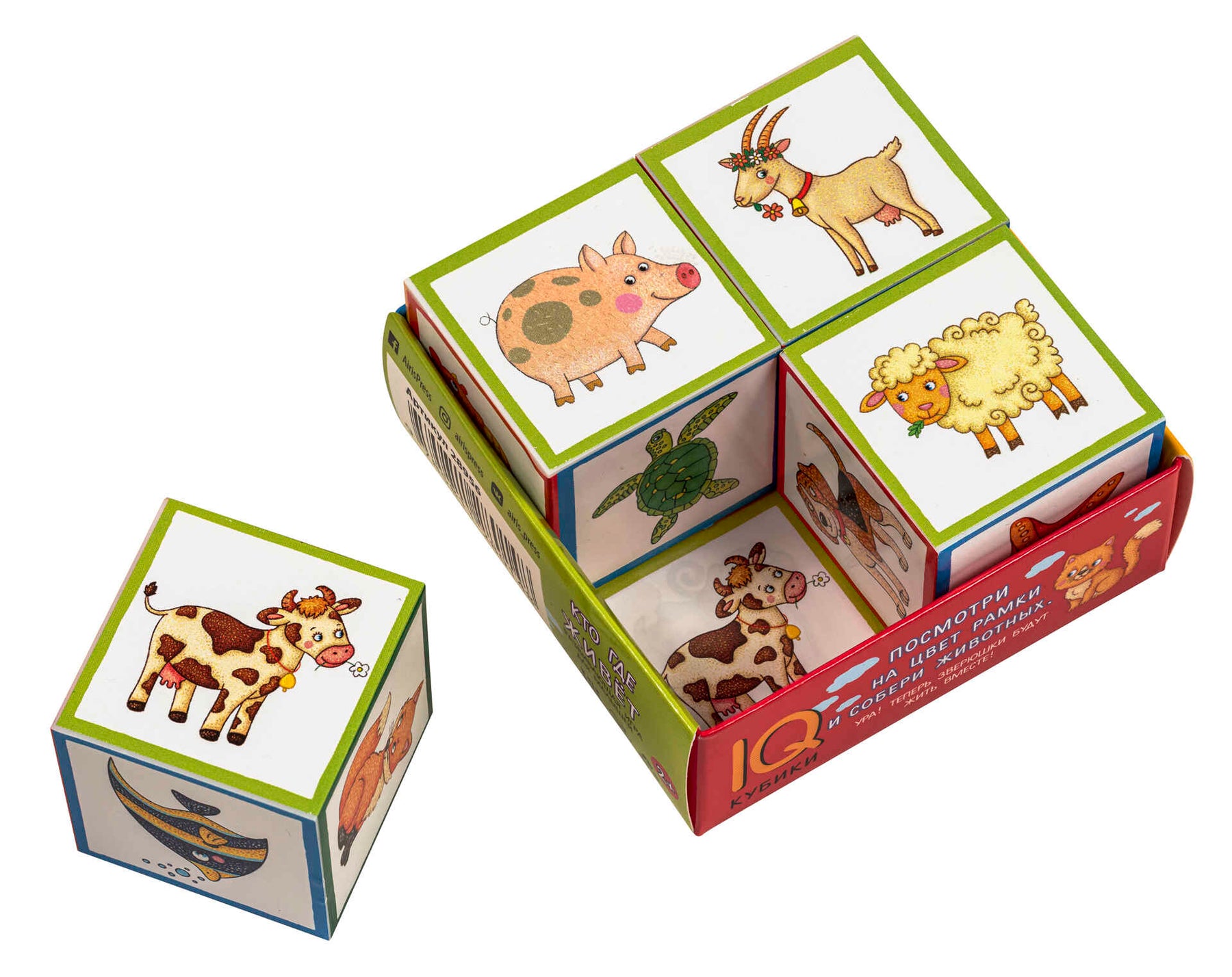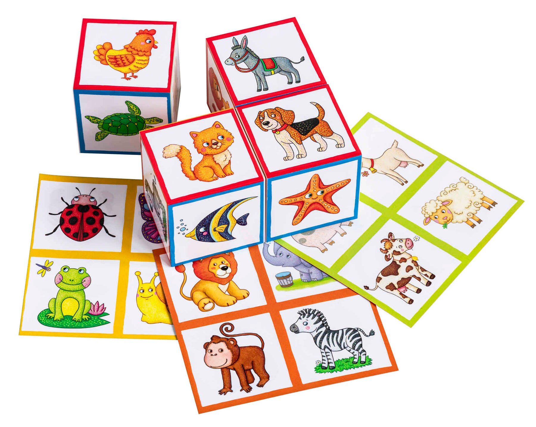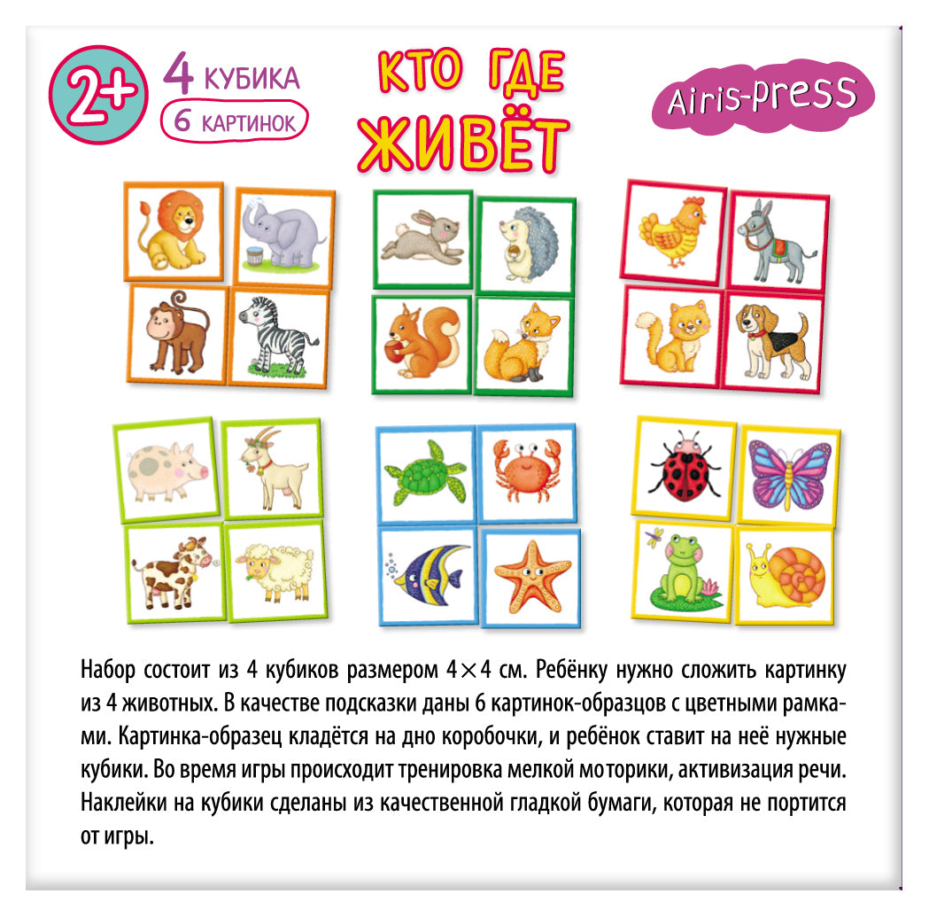 Набор состоит из 4 кубиков размером 4х4 см. Эти кубики познакомят малыша с животными, помогут расширить словарный запас и развить координацию рук. Особенность набора в том, что на каждой грани кубика дано целостное изображение животного. Цель игры — собрать картинку из четырёх животных, опираясь на цвет рамки. В процессе игры можно обсудить с ребёнком, где обитают эти животные, что между ними общего и чем они отличаются.