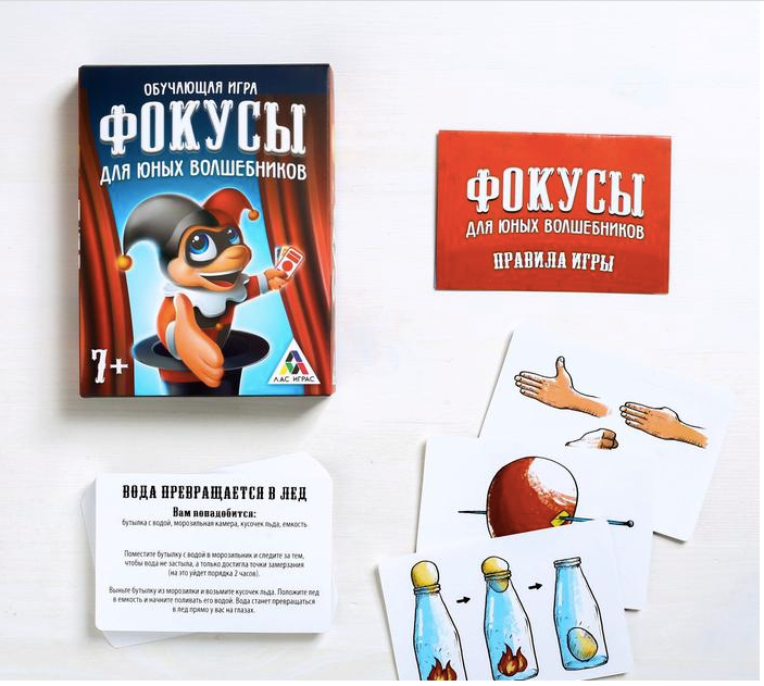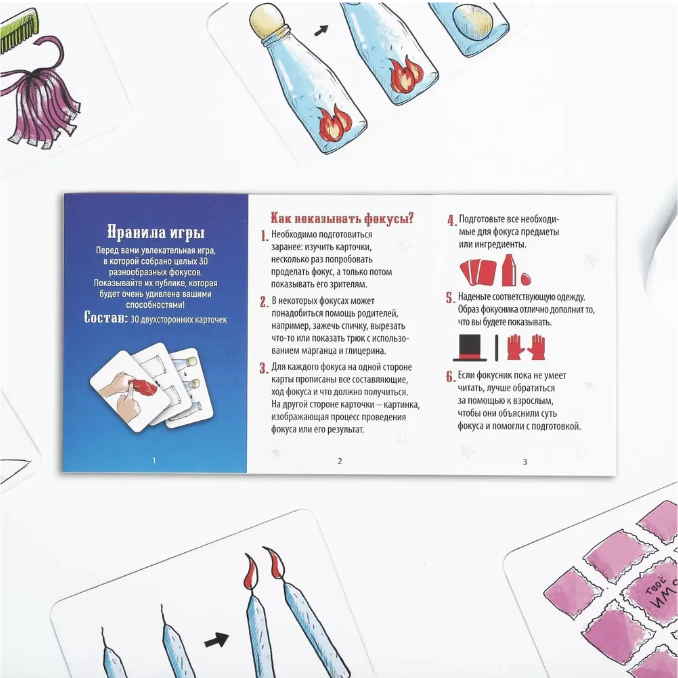 Все фокусы можно показать в домашних условиях, специальный реквизит не нужен. Поэтому скорее выбирайте карточку, изучайте её и творите настоящую магию! Подготовьте все необходимые для фокуса предметы или ингредиенты. Наденьте шляпу или плащ, подберите загадочные украшения.