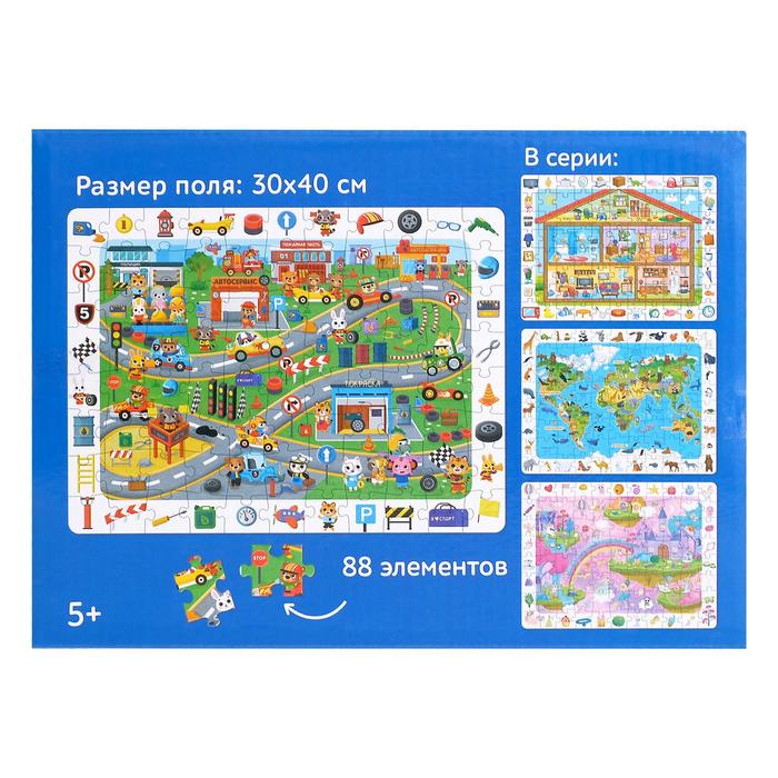 Пазл «Найди и покажи. Весёлые гонки в городе» — это занимательная развивающая игра в новом формате. Ребёнок соберёт пазл из 88 крупных деталей, а затем найдёт разные предметы, связанные с гонками, тем самым расширит кругозор и потренирует внимательность.