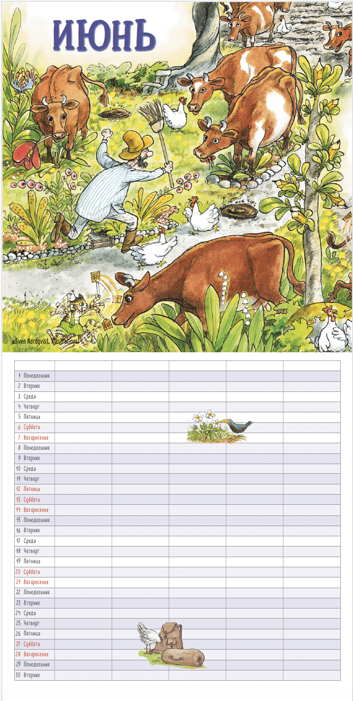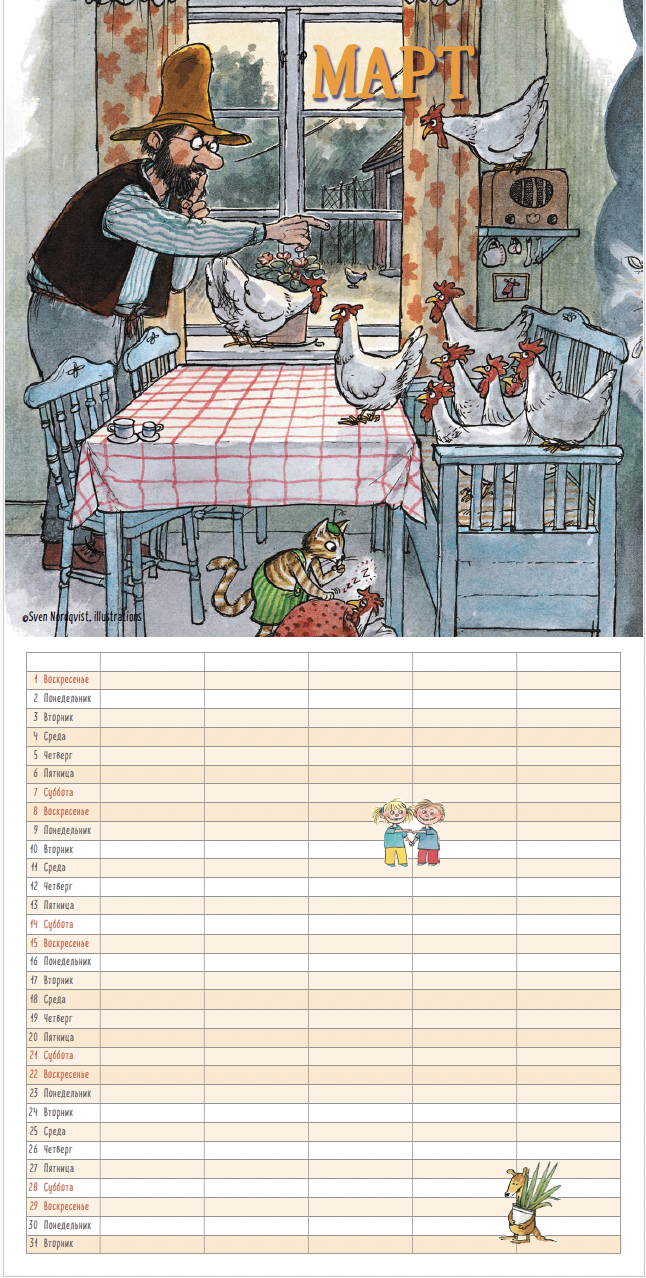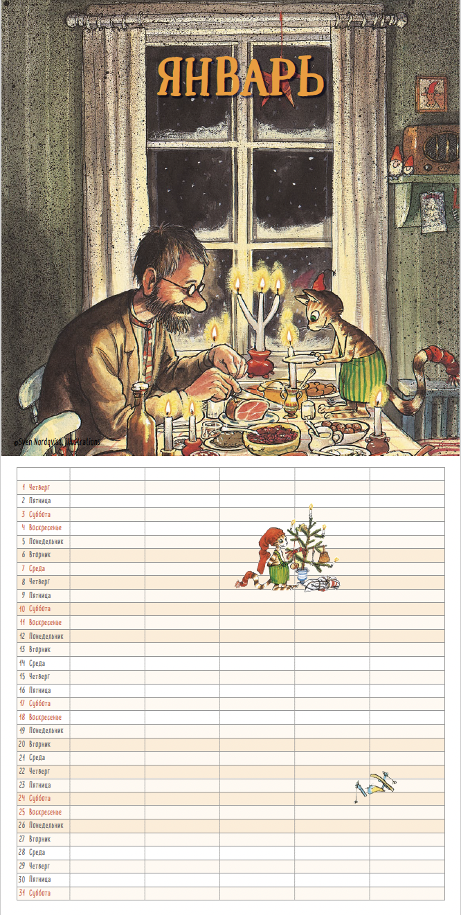 Традиционный семейный календарь на 2026 год с любимыми героями Свена Нурдквиста. Он оформлен в виде планера: слева числа и дни недели, справа – пять столбцов с пустыми ячейками. Столбики можно подписать, а затем добавить дни рождения друзей или составить список дел на каждый день. Каждый месяц начинается с картинки из книг о Петсоне и Финдусе.